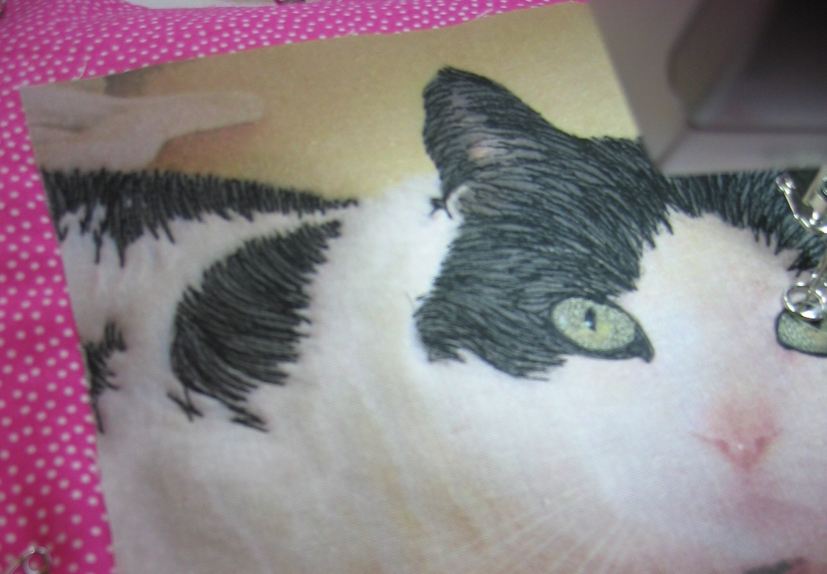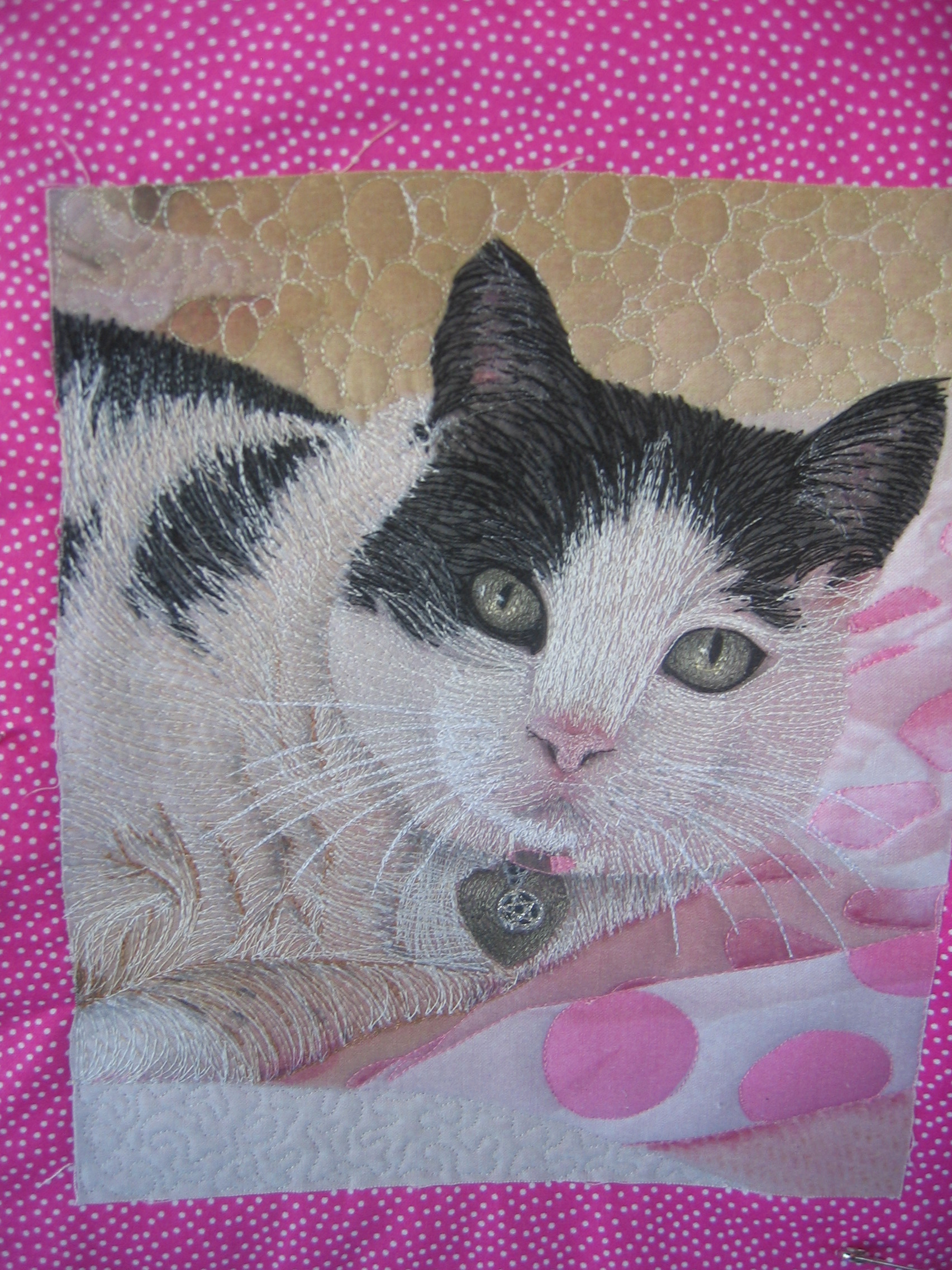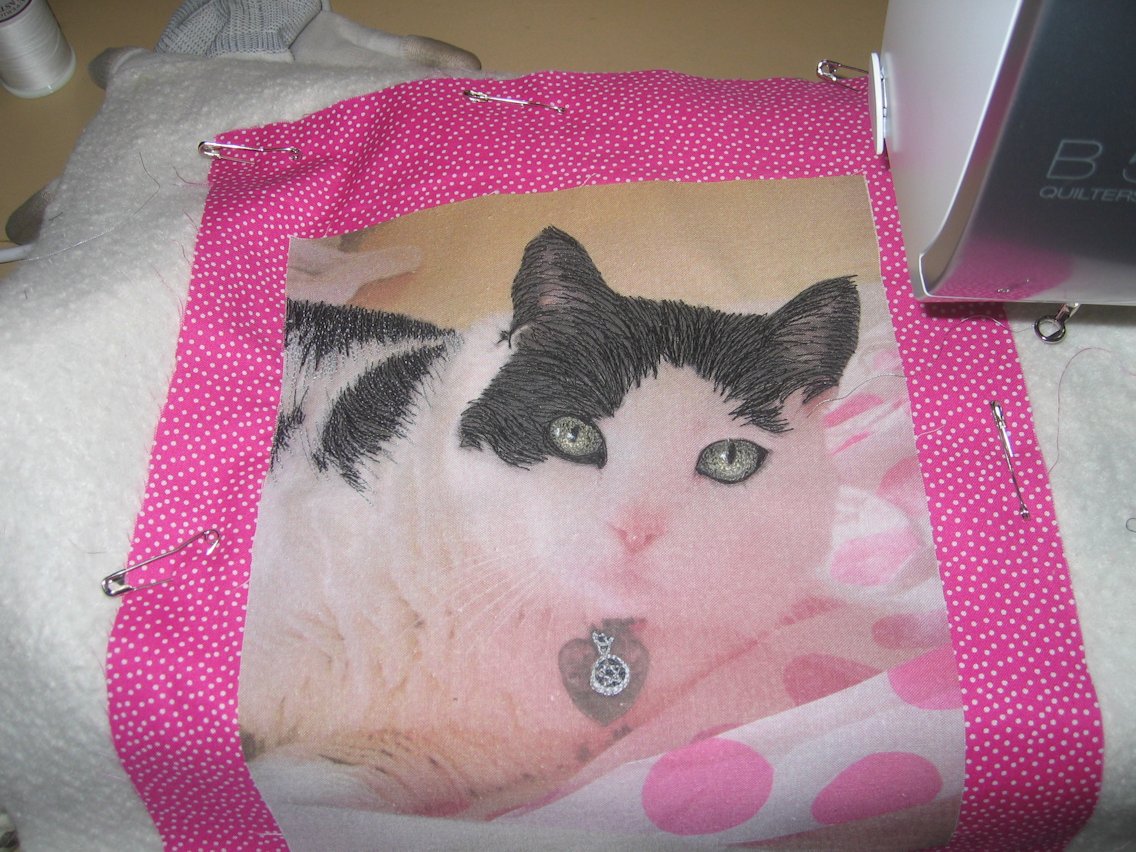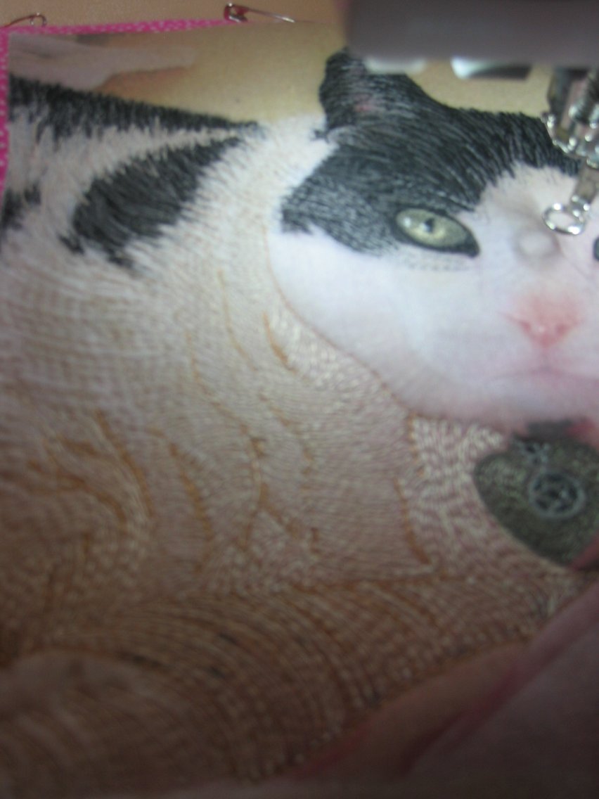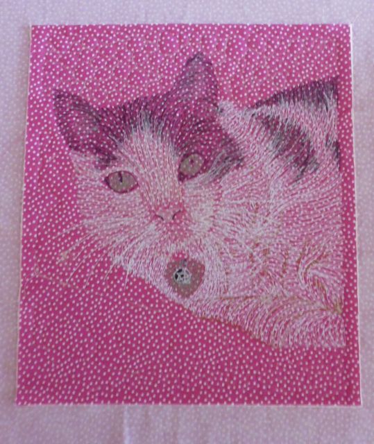 For my second piece, I decided to do my friend Sue’s cat, Kassie. Sue had sent me the photo some time back, and it was such a pretty photo it was impossible not to consider it for thread painting. And Sue’s a ‘pink’ girl, so the pink spots on the tissue paper Kassie is lying on were perfect. To set it off, I purchased a pink and white spot fat quarter from the store set up here as Asilomar for the quilting weeks.