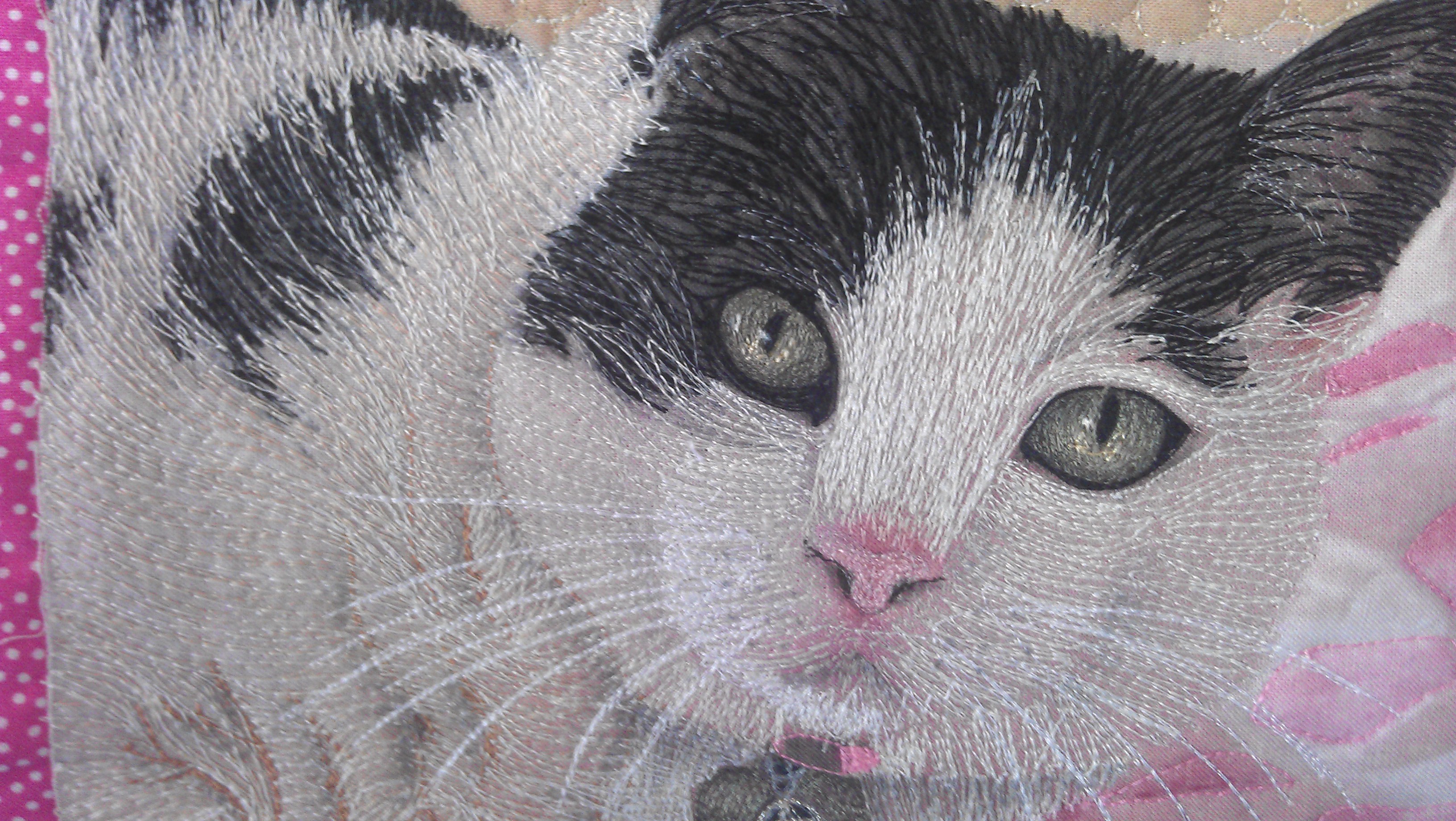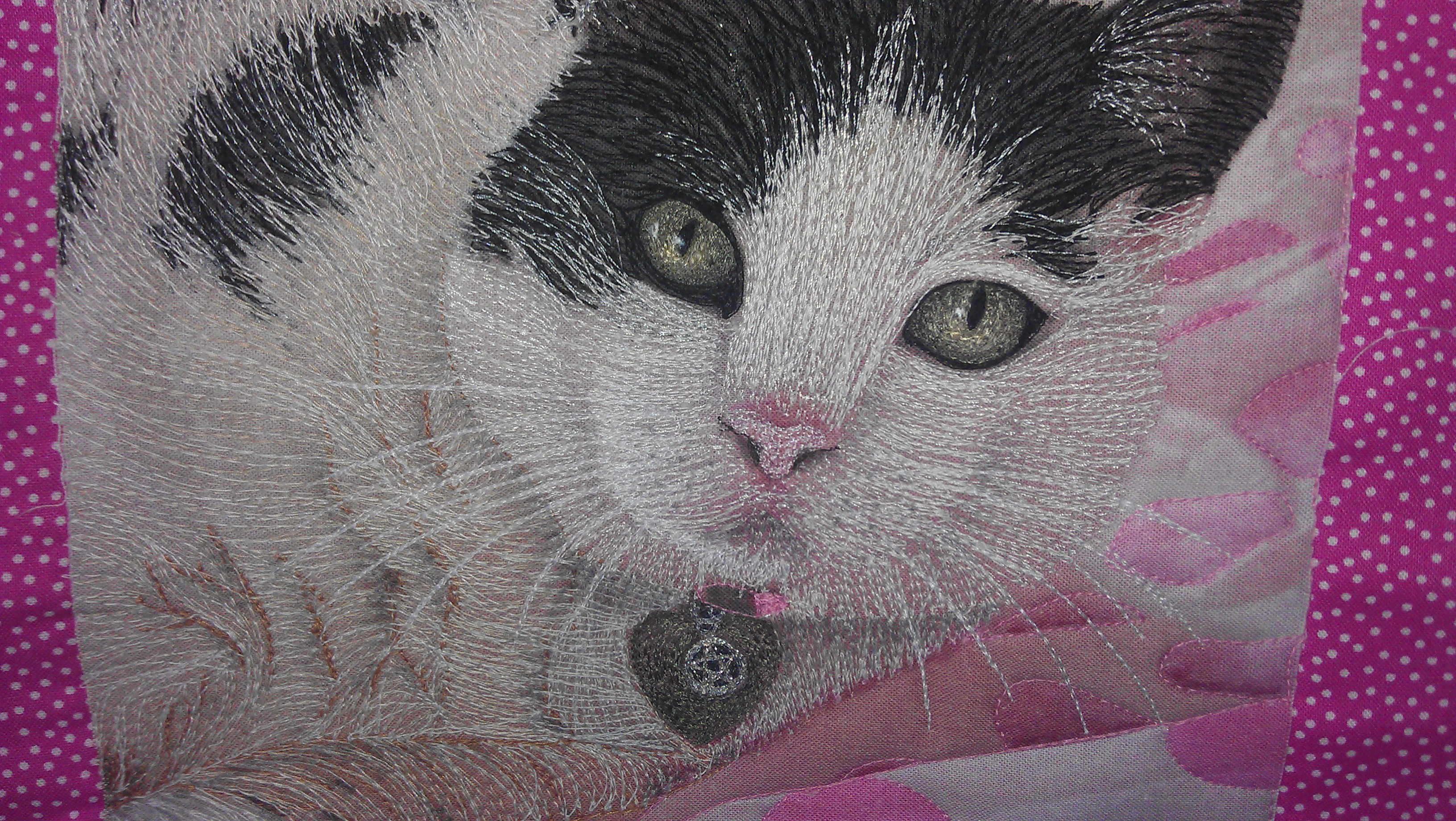 The biggest problem with doing a cat like this was how to stitch the folds of white fur. The black was easy, and the places where the fur laid down in one direction was also fairly easy, but those folds were hard to do. I started off with a soft tan thread, then some grey, then cream and an off white, and after I had finished stitching, I used a soft grey Copic marker to shade the folds a little.