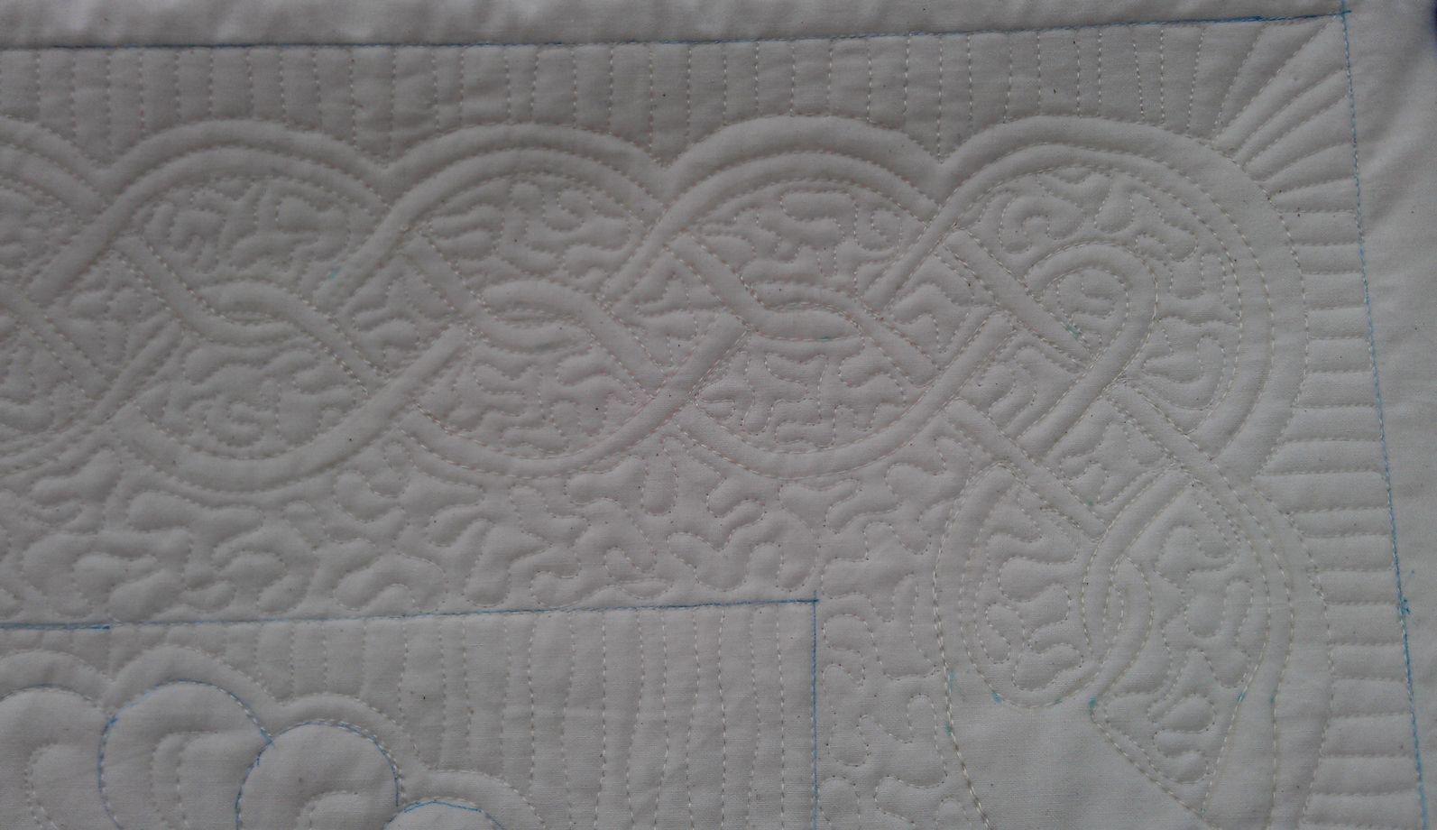 With the central Celtic knot design, I did some very tight scribble stitching inside the background areas, then less and less tight stitching heading out to the edge to the 12″ square. I was really pleased with how it came out, as my original intention was to do tight scribble stitching for the entire square. However, I thought it might pull the quilt out of shape if I did that, so I changed tack and made the outer areas far less tight, though it’s still scribble stitching.