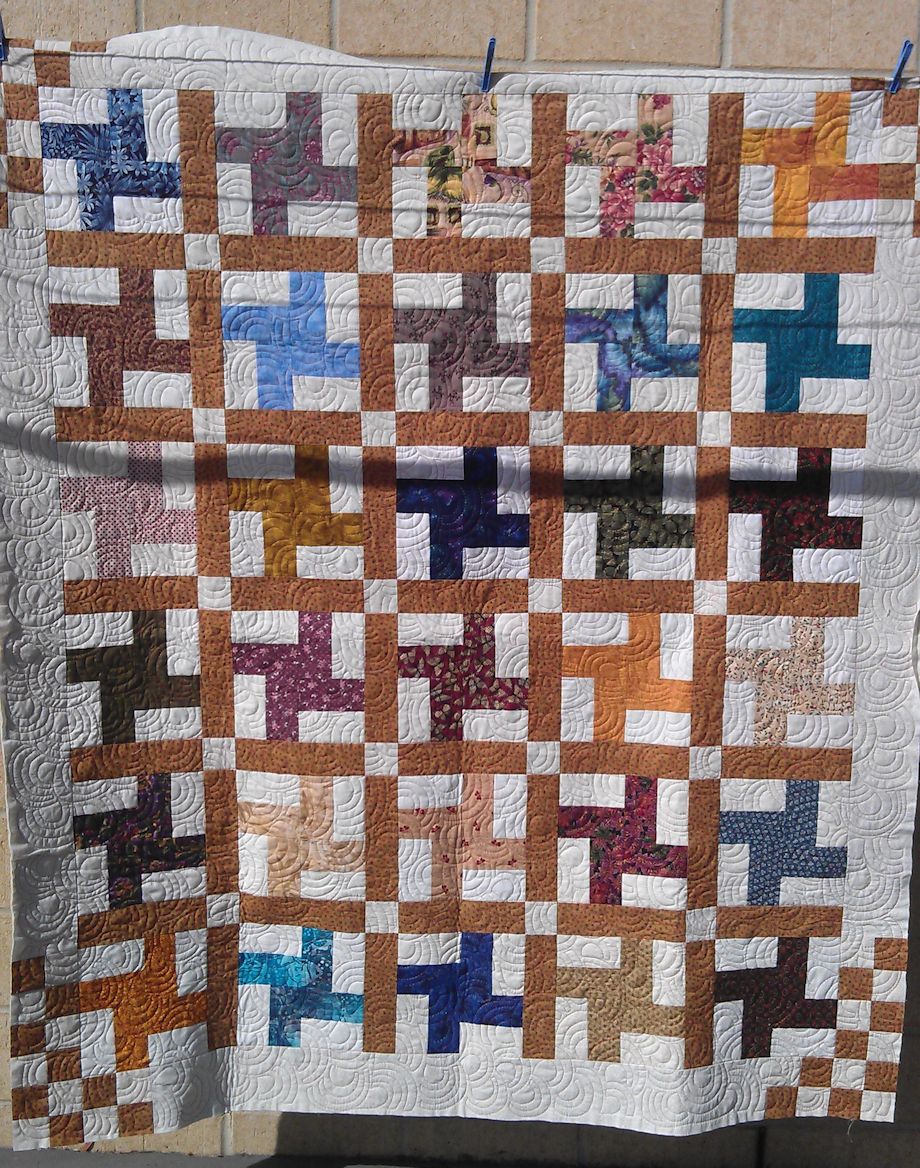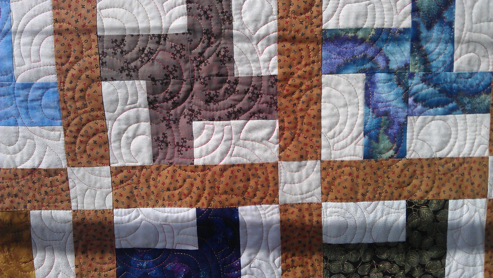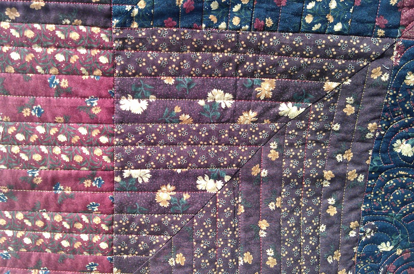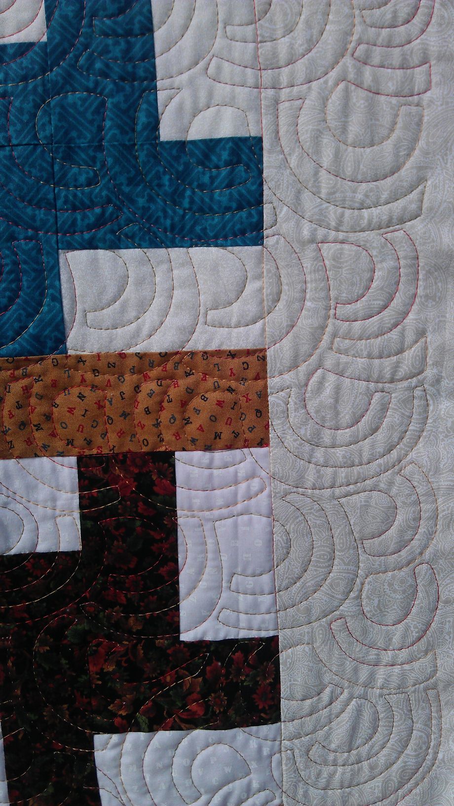 I’d seen quilts that blended one motif into another but hadn’t tried it myself, so I sort of did that. The motif I used for the blocks next to the straight line blocks was a curved open headband motif with squared off edges, and then the one for the blocks and piano key border adjacent to that was a full circular spiral design, thus varying the quilting from one edge to the other from straight lines to circular lines.