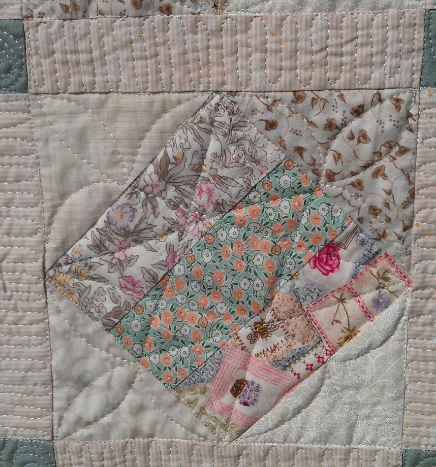 For the main blocks, I did a 3-petal flower type thing in the cream triangles. And then I came to a screeching halt. What to do in the 3-strip centre blocks?