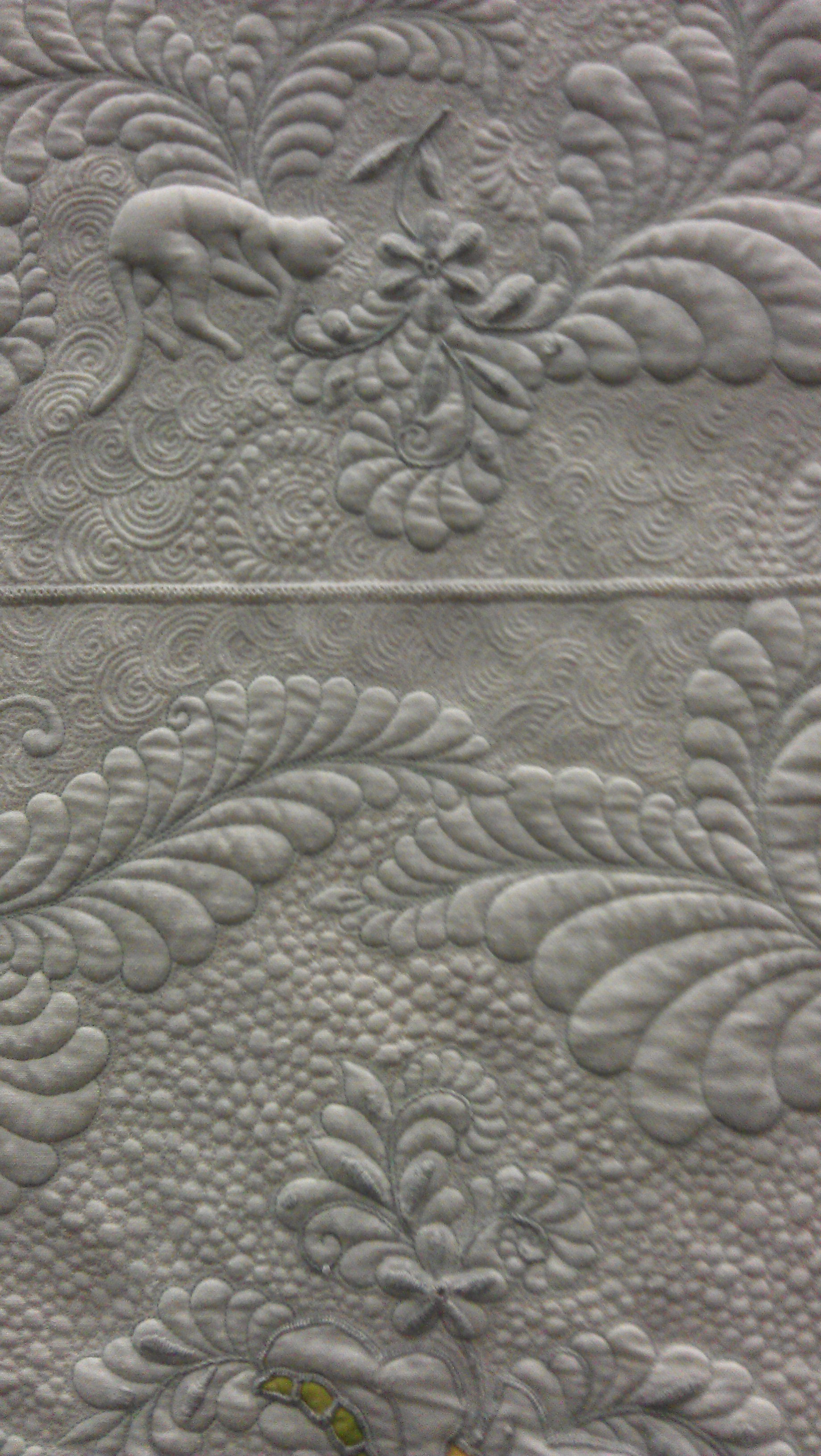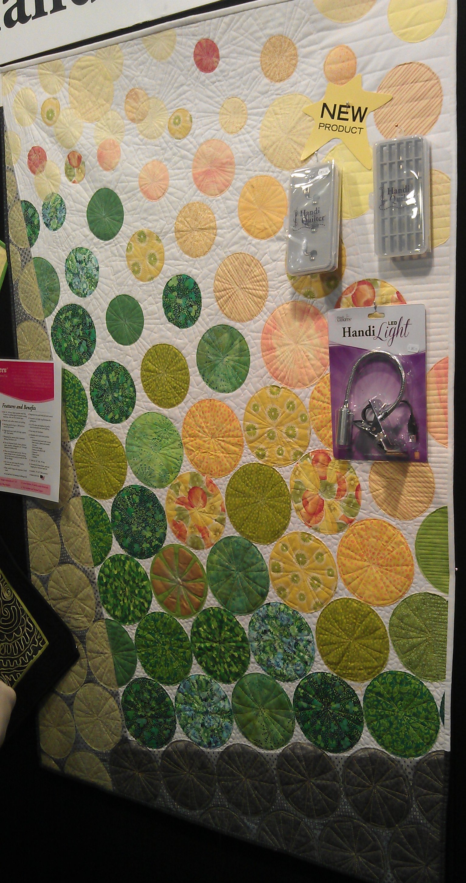 Whole cloth quilt by Helen Godden, who marked circles then couched various areas of the circles in knitting yarn to create this multicoloured effect. Clever.