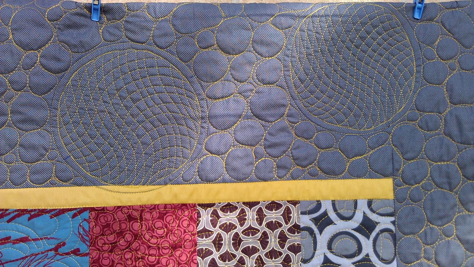 After I finished stitching all the circles and their centres, I had decided to do a simple all-over motif for the gaps between the circles in the very busy fabric of the main part of the quilt top. To echo the circular motif, I stitched a squared-off-end version of my ‘open headband‘ motif across all the open areas. And then I stitched circles/bubbles/pebbles in the open areas of the grey borders.