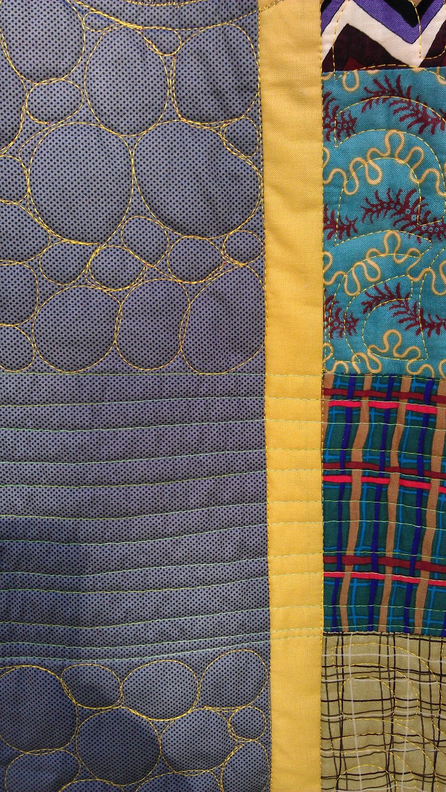 On pulling this one out of the bag, my first thought was to quilt it in yellow to set off the grey in the uneven width borders and to echo the yellow in the sashing strips (only on 3 sides). My second thought was to quilt the ‘white space’ in the borders with more circles (or pebbles or bubbles, or whatever you want to call them). I wasn’t quite sure what to do in the main top where the busy fabrics were.