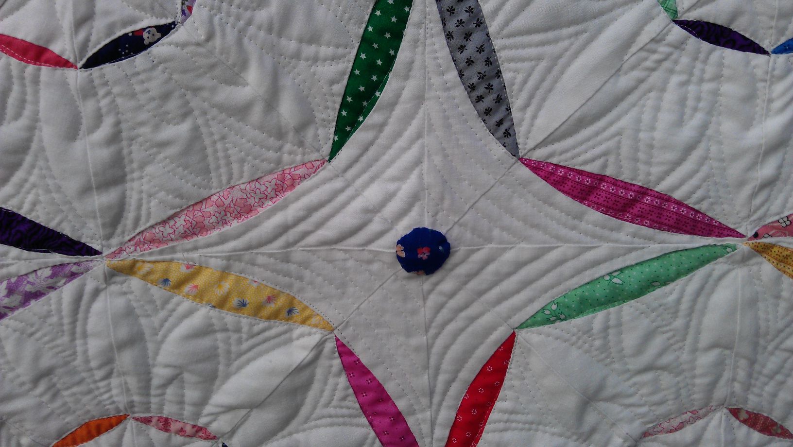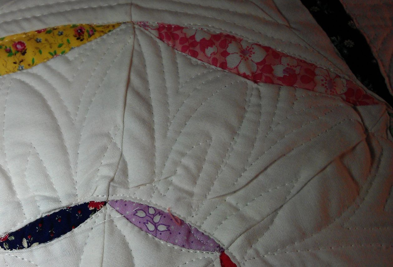 Why was it such a challenge? Well, it was FULL of bias edges, very thick seam joins, and lots of puffiness as a result of those bias edges. I had to do a LOT of quilting on it to try to flatten it, and I think I succeeded, for the most part. However, there are still parts of this quilt that have pleats and folds that I just couldn’t get out. And where the big circular blocks join, there are masses of seams that come together to form a big lump — having already snapped a needle off in the bobbin case before (which cost me $$ to have fixed as well as a trip to the city), I wasn’t going to attempt to sew through those. Someone has carefully appliqued on little circular disks into the centres of the other seam joins, and I’ll be suggesting that they add more where those horrible lumpy seam joins are.