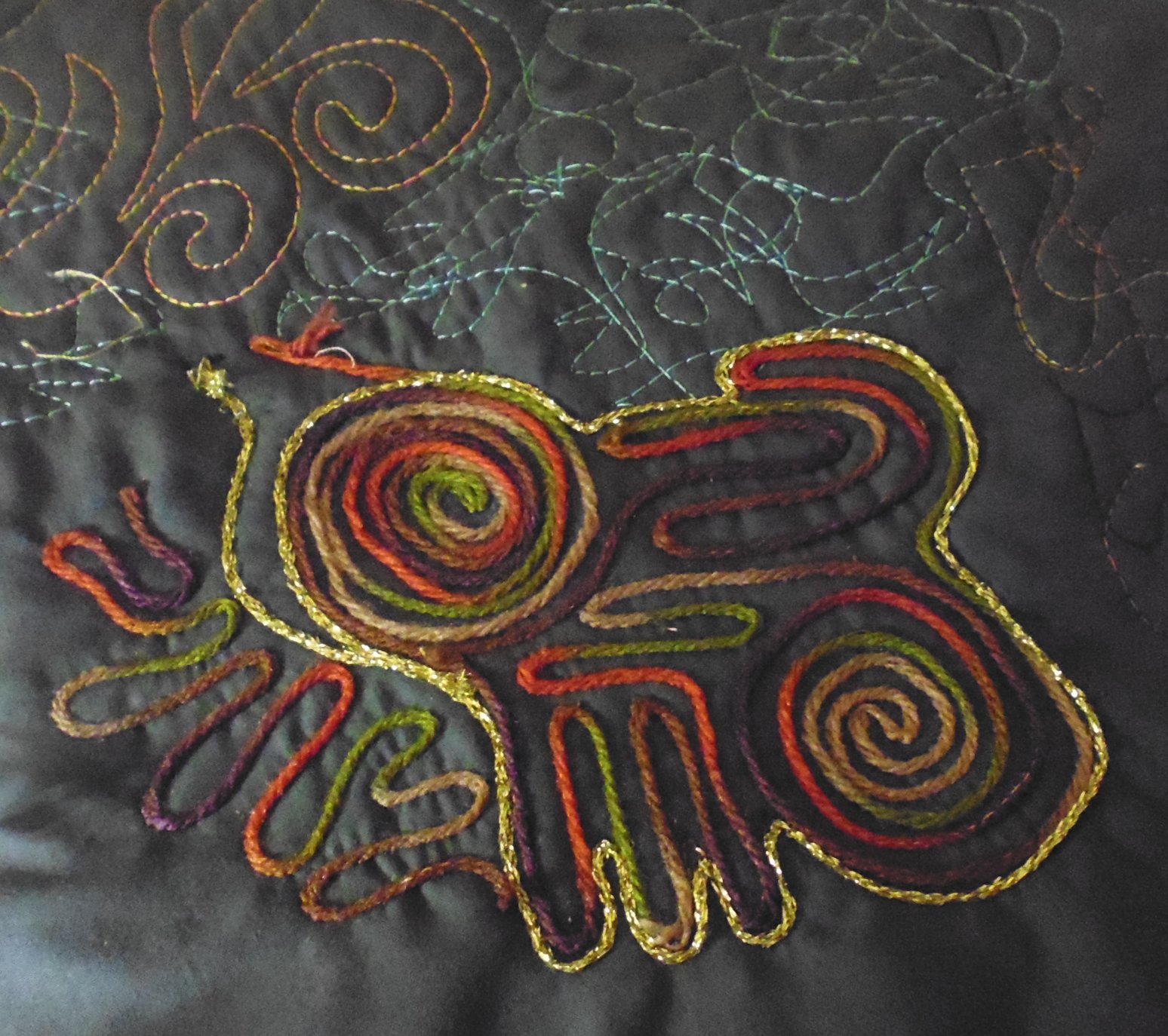 It all looked a bit plain, so I filled in the inner part of the boomerang with a scribble stitch just using the brown variegated thread I had in the needle for the couching. Then I made up some elongated curved lines and spirals for the rest of the small sandwich, emulating the spiral pattern inside the boomerang.