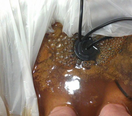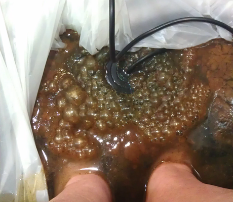 My feet were placed in lukewarm water in a special tub, wires were connected, and some salt was sprinkled into the water. The attendant then turned on the machine. And almost immediately rust coloured water and particles started coming out of the round black thing in the water. NOT out of my feet, but out of this container (the arrow shows this happening).