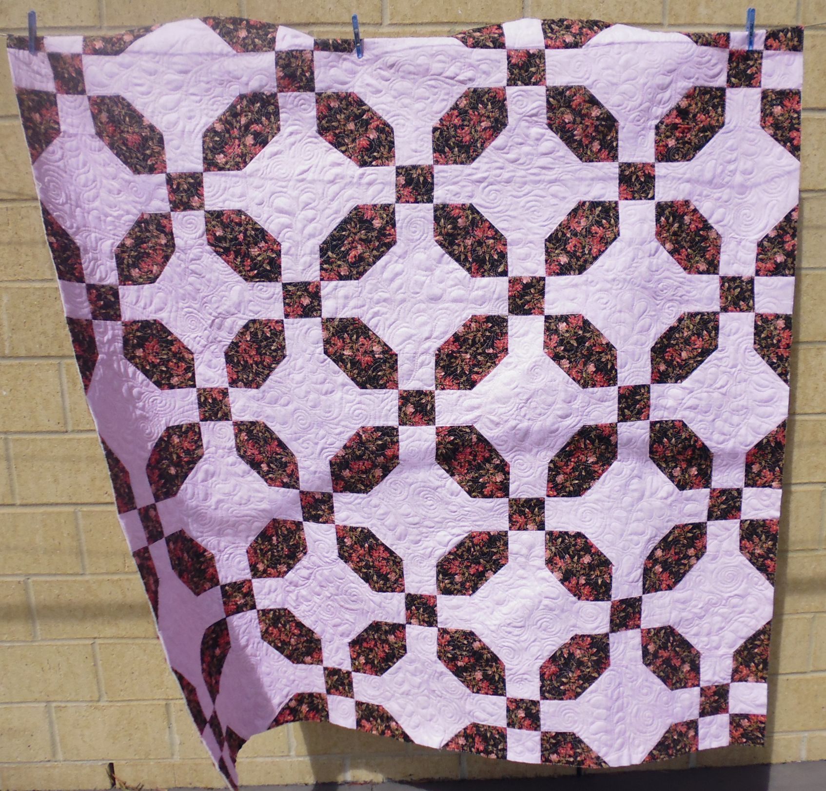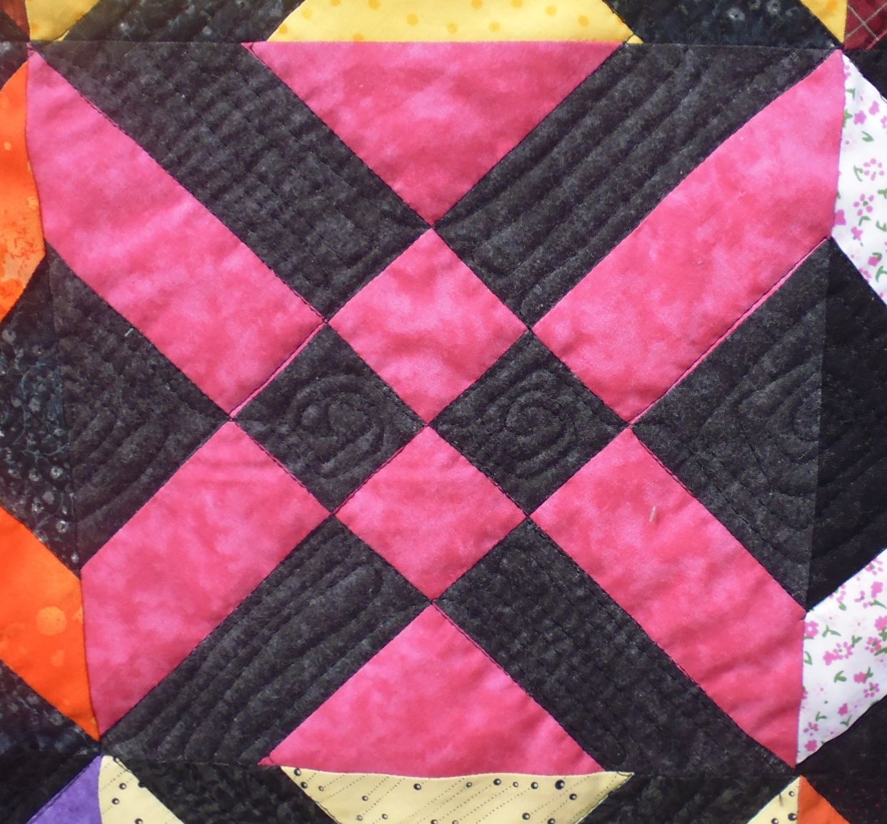 How to quilt it? Well, for starters, I stitched in the ditch around all the dark shapes. I was thinking of doing something geometric in the pink areas, but I only had three small spools of various pale pink threads from different manufacturers, so I decided to do an all-over motif so that it wasn’t obvious where I changed threads as each spool ran out. I mostly did a combination of feathers and spirals.