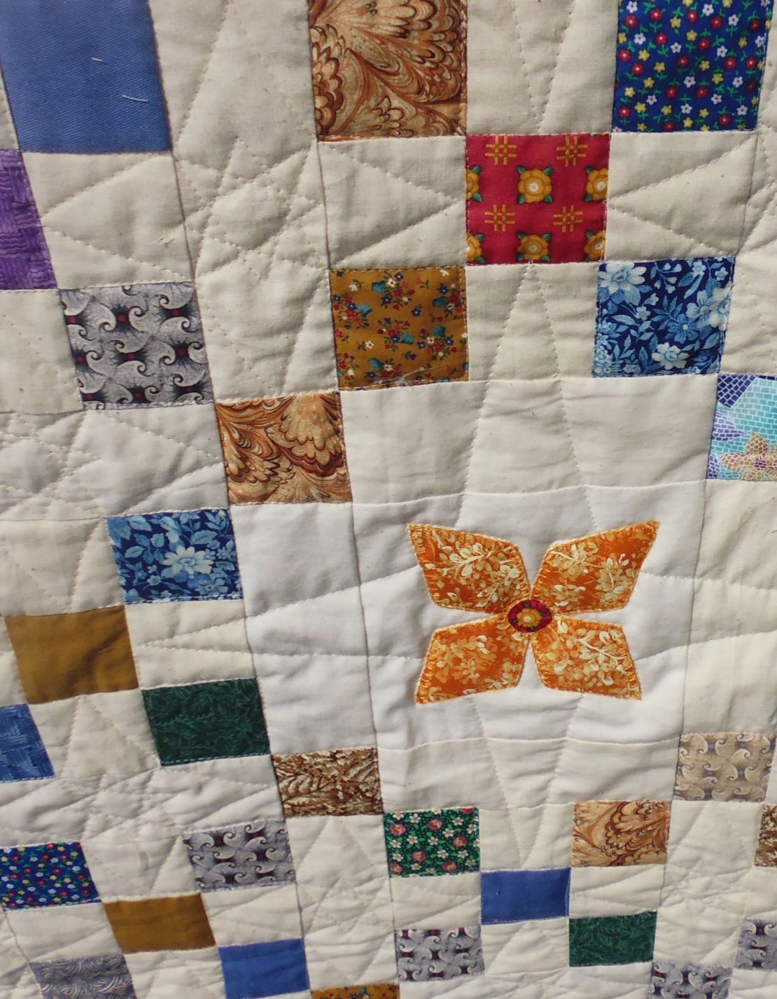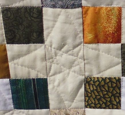 I knew I’d have to stitch in the ditch around all the scrap fabric squares, so I started with that. The empty white spaces were then quite puffy, so I did a simple point-to-point star effect, but still the middles were too puffy, so I did an eight-pointed star inside each one of the big white spaces.