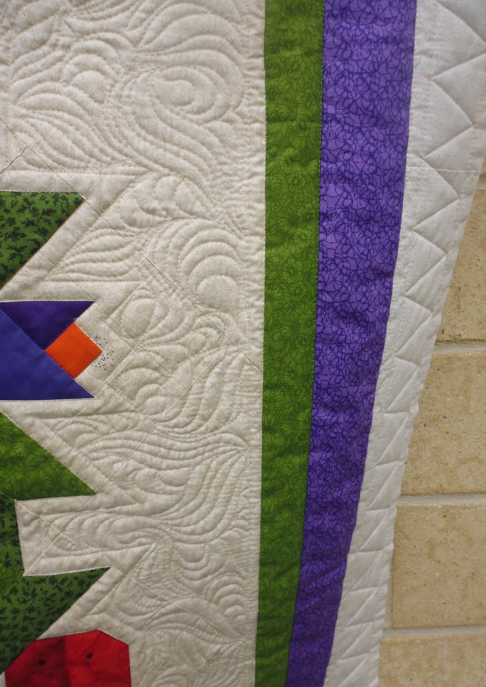 • Top: Mettler Metrosene (polyester, 40 wt?, colour 781 [off-white used for most of the stitching on this quilt]; Gutermann (polyester, 40 wt?, colour 156 [red around the ladybugs]; Madeira (rayon, 40 wt, colour 1169 [green for the stitch-in-the-ditch in the border]; Gutermann (polyester, 40 wt?, colour 810 [purple around the flowers]