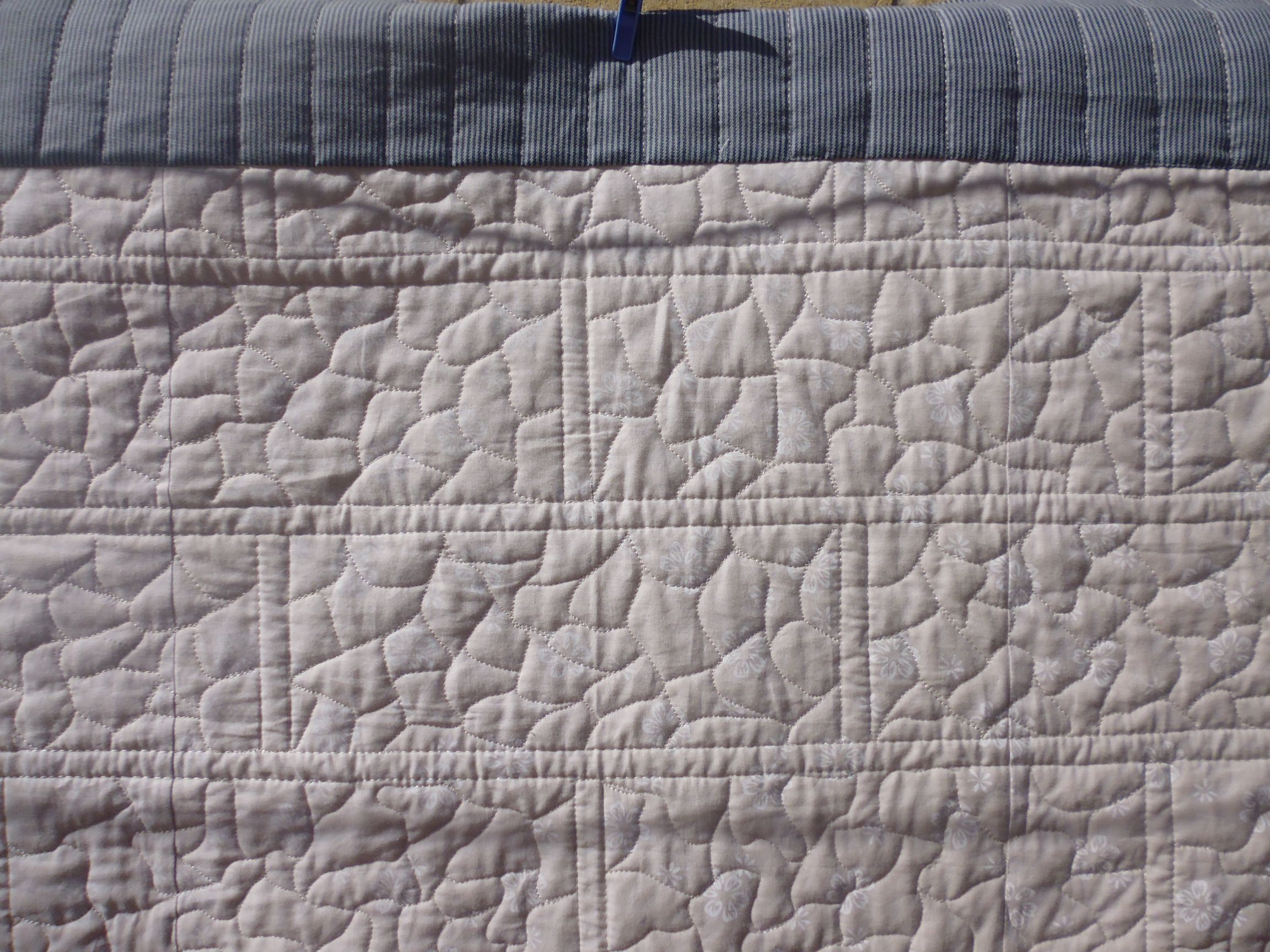 There was SO much white space in this large quilt that it was almost a wholecloth quilt. The fabrics and colours in the borders sort of indicated that the eventual home for this quilt might be a men’s homeless shelter that the Community Quilts program donates quilts to, but then there was that very strange bald woman in a pinafore holding a teddy bear in the middle! What was up with that? And then there were those strange scrappy log cabin blocks in the corners, which seemed out of place with the rest of the fabrics and design.