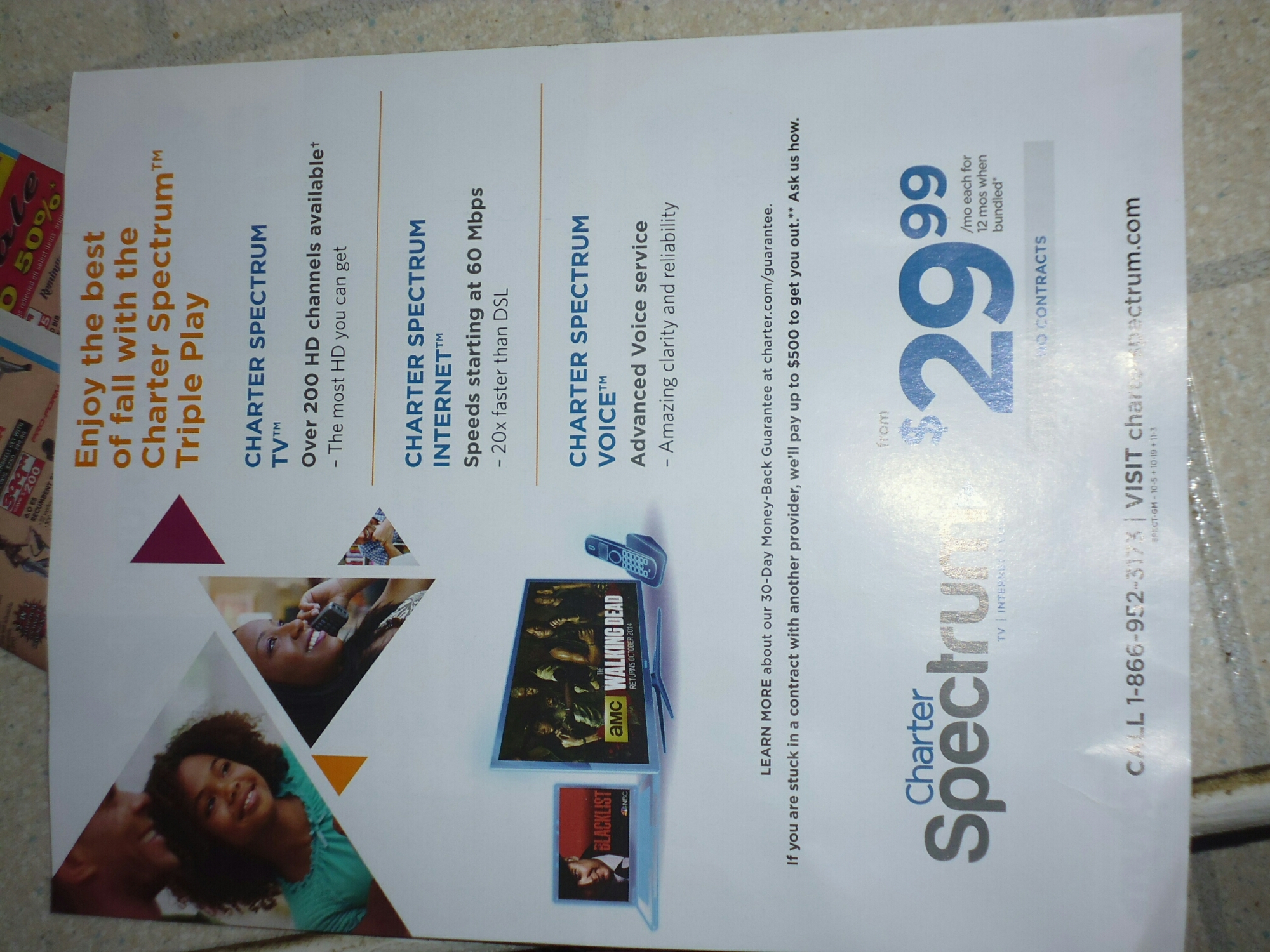 a) Charter Spectrum – I actually use this company and my bill is definitely not that cheap (and in the tiny print it probably says it is only good for 6 months). We pay about $140 for cable and internet. The phone they are listing is the house phone (using internet) – not mobile (cell phone). We have a family plan for our cell phone so it is about $50 per line (it was more per phone when we only had the one cell phone).