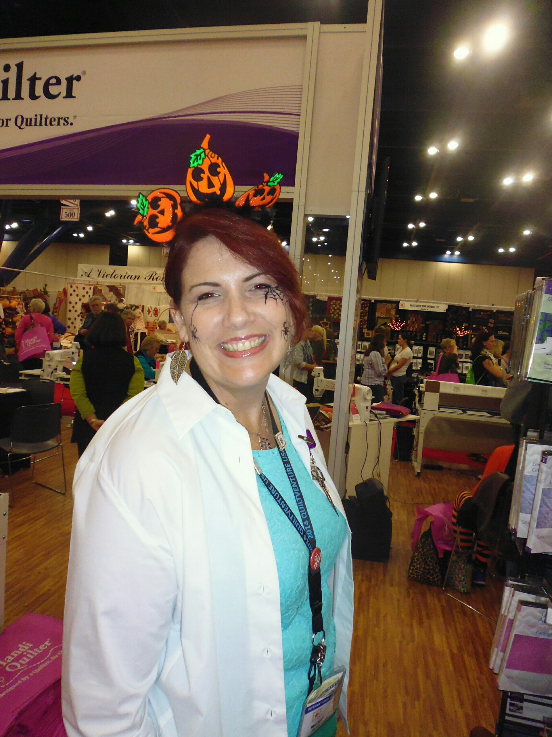My final class of the day was an evening one (6 to 9pm). Like the one the other day, it was a long-arm class on borders. The tutor (DeLoa Jones) taught us quite different techniques than the previous class, so I’m glad I did both. We were using Gammill machines, with two on each 18ft frame. These are BIG setups, but despite the size and weight of the machines, you can move them with a fingertip.