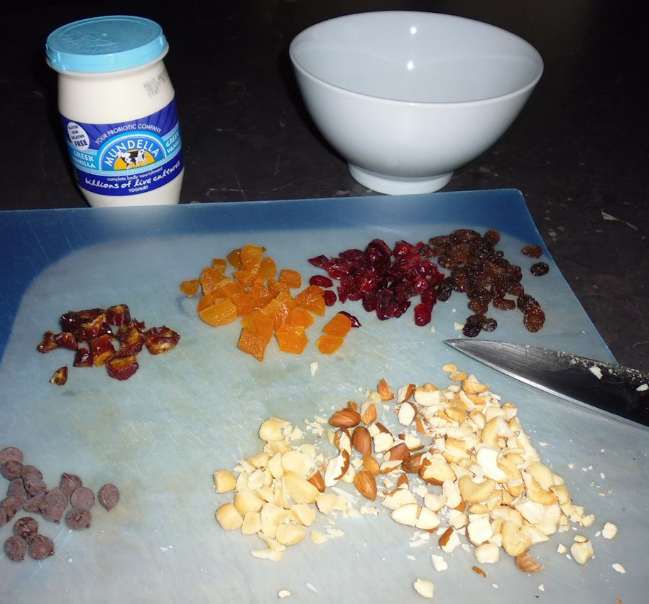 - whatever else you want! I decided to go healthy with fried fruits and nuts. I chopped up some nuts (cashews, almonds, macadamias), some dried fruit (apricots, a date) and added some more dried fruit that was already in small pieces (cranberries, sultanas). For the batch I’ve photographed below, I also added a few dark choc bits (used for chocolate chip cookies) and some passionfruit pulp. You could use fresh fruits like blueberries, strawberries, stone fruit, mango, banana, or whatever you like.