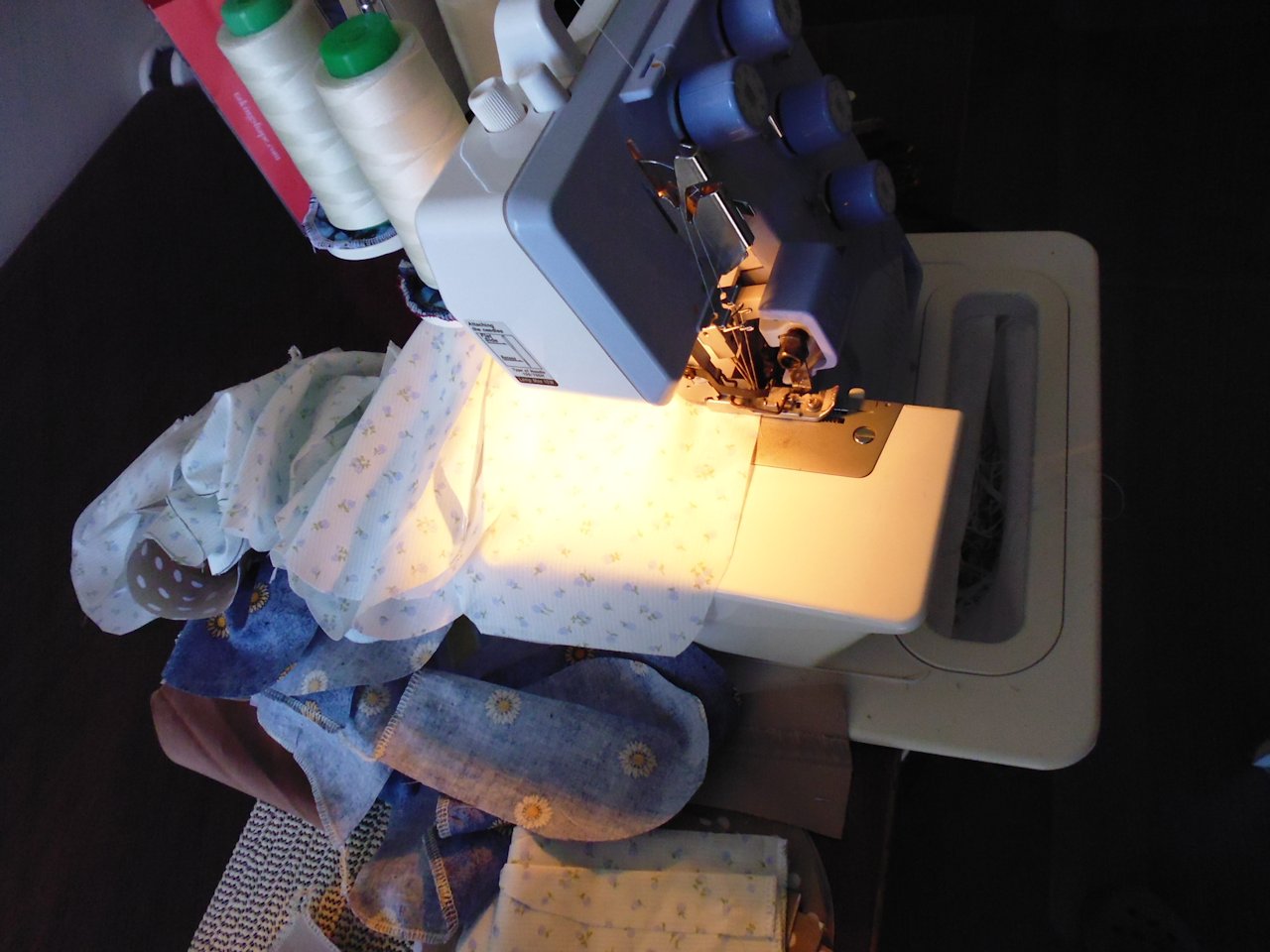 It took me no time at all to find some old fabric scraps and pieces of fabric I no longer cared for that were big enough to make mittens from. I ironed and cut out all the pieces, then dusted off my overlocker (serger), which I hadn’t used in several years. After rethreading it (fun… not!), I got sewing.