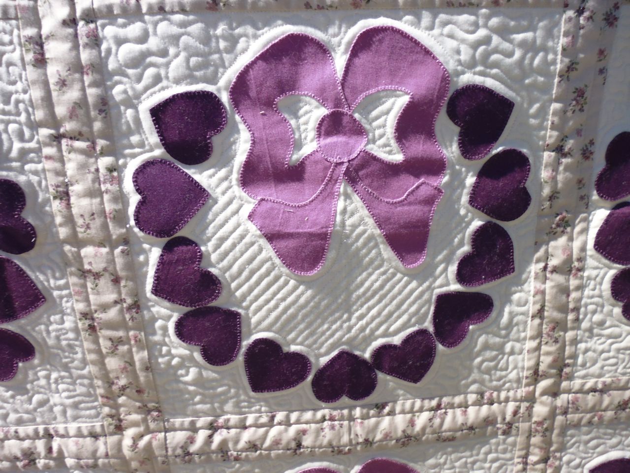 Someone had spent a lot of time cutting out and carefully appliquing all those little hearts and big bows to create wreaths inside each block of this quilt.