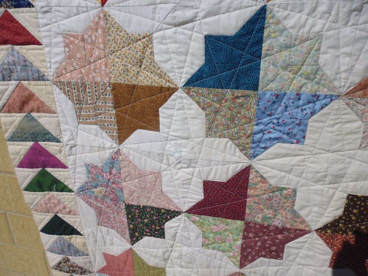 This quite traditional quilt offered me a challenge — how to quilt it? I thought about all over designs, feathers, spirals etc. But nothing grabbed me as being suitable. Instead, I opted for using my Line Tamer ruler and stitching 8-pointed stars in the coloured parts of the blocks, and slightly different 8-pointed stars in the white space (after stitching in the ditch around all the stars in the blocks and flying geese…).