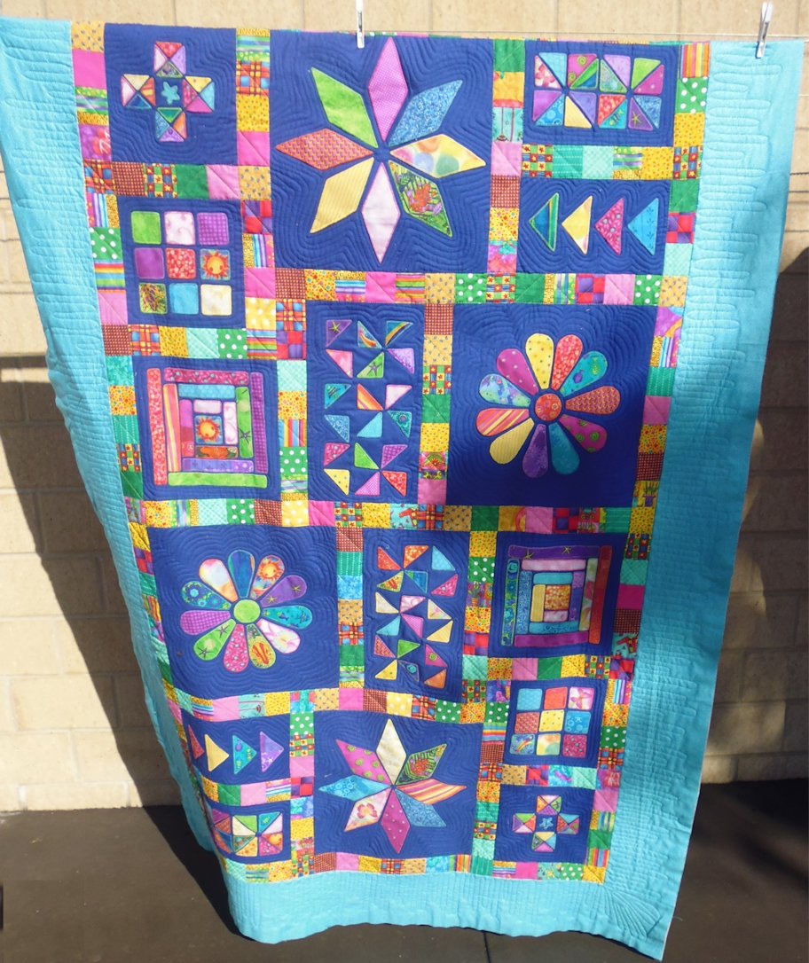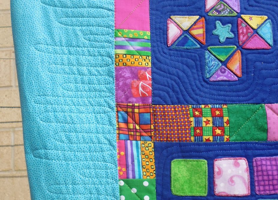 The base of the quilt is a 7×10 piece of Floriani ‘Stitch n Shape’, layered with some batting, and covered with the navy fabric. I turned over the edges and glued them down (Elmer’s School Glue). Then I used another piece of navy fabric to cover the back, turning under the edges, gluing it to the back, and then topstitching the layers to hold them together. Next, I added Velcro hook pieces on the back as per the OMG guidelines (NOTE: If I did another like this, I’d add the Velcro to the backing piece BEFORE gluing and stitching it to the back).