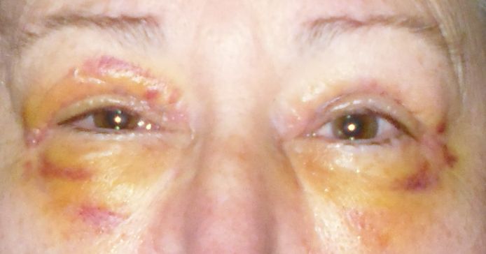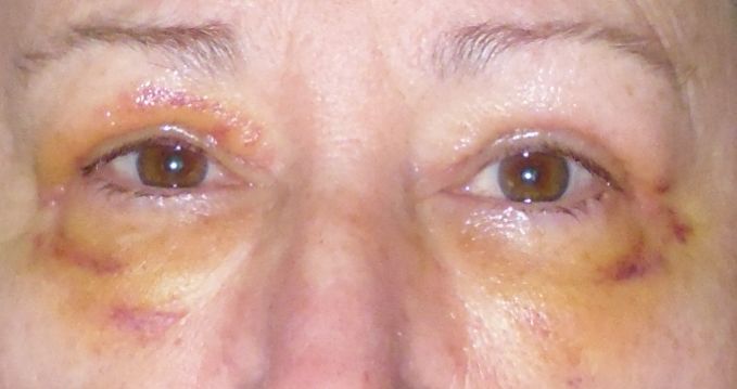 • Follow instructions — I was given ointment to put onto the incisions for the first few days, and was told to use the ice packs the hospital gave me. I was religious about the ointment; not so much the ice packs, unless I noticed the swelling. I should have been more diligent with that. When I had the stitches out yesterday (a painless procedure, by the way), I asked about when I could start using my cosmetic eye cream again and was told about another two weeks. However, the person who removed my sutures said it was OK to stop the ointment and to use something like a drop of Bio-Oil in the interim.