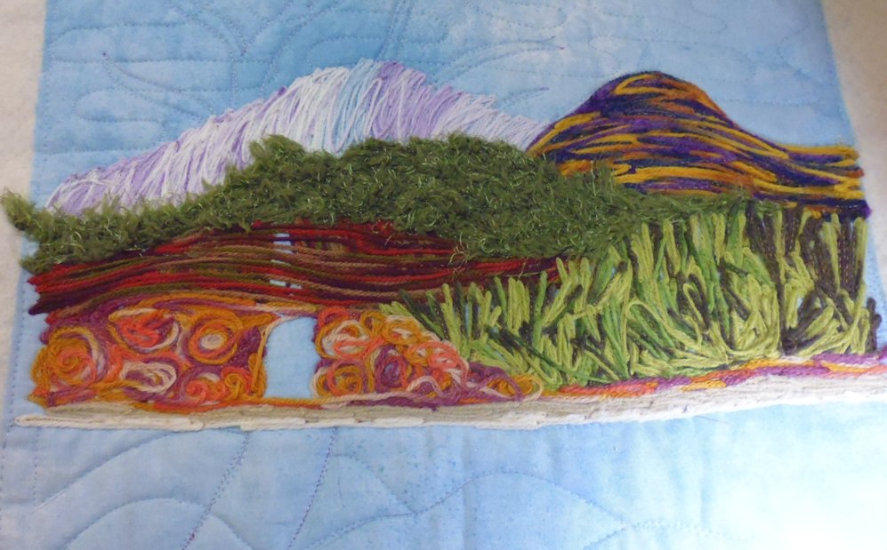 I stitched the front hills with a variegated 8-ply purple, blue, orange, brown, and yellow yarn. Helen thought they looked like The Bungle Bungles (Purnululu)!