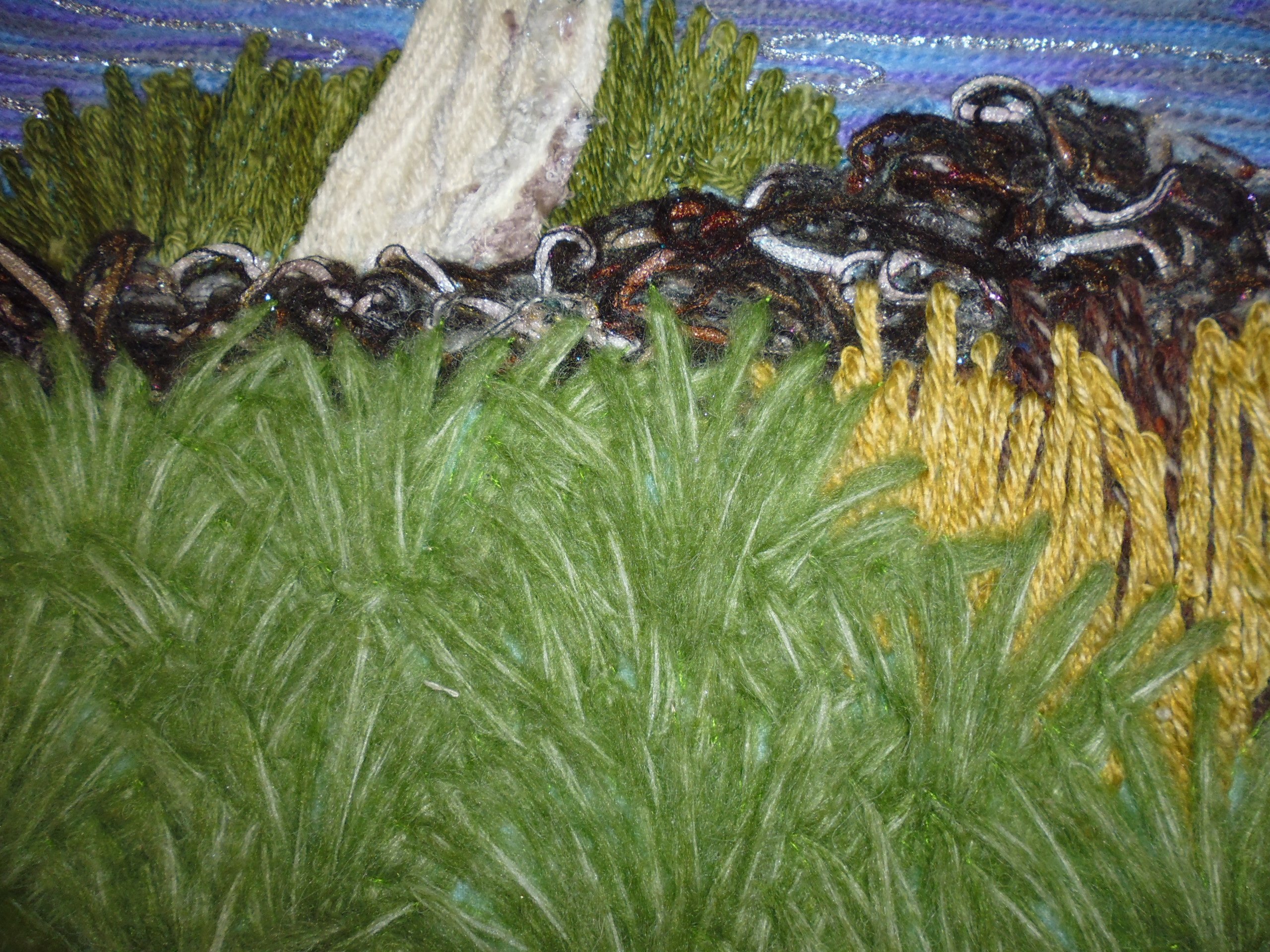 After adding the water, the reeds behind the tree, and the tree, I stitched the foreground elements. I was REALLY pleased with the effect for the plants right in the foreground — I used the same soft furry green yarn I’d used for the fern on the wren piece. Again, the cream core of the yarn showed through as veins on the leaves. LOVE that yarn!
