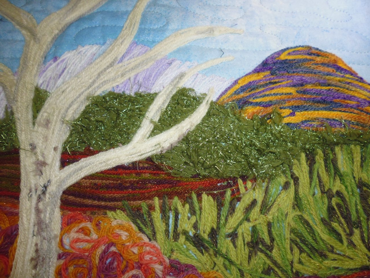 After tracing the pattern onto our sky fabric, creating our quilt sandwich, and stitching down the main elements of the apttern to stabilise it, we started couching the elements furthest away — the hills in the background. I used a variegated 4-ply baby-soft yarn in creams, soft blues, and mauves for the snowy mountain range. The close-up of the needle shows the special plastic surround of the couching foot and the hole that the needle, thread, and yarn go through.