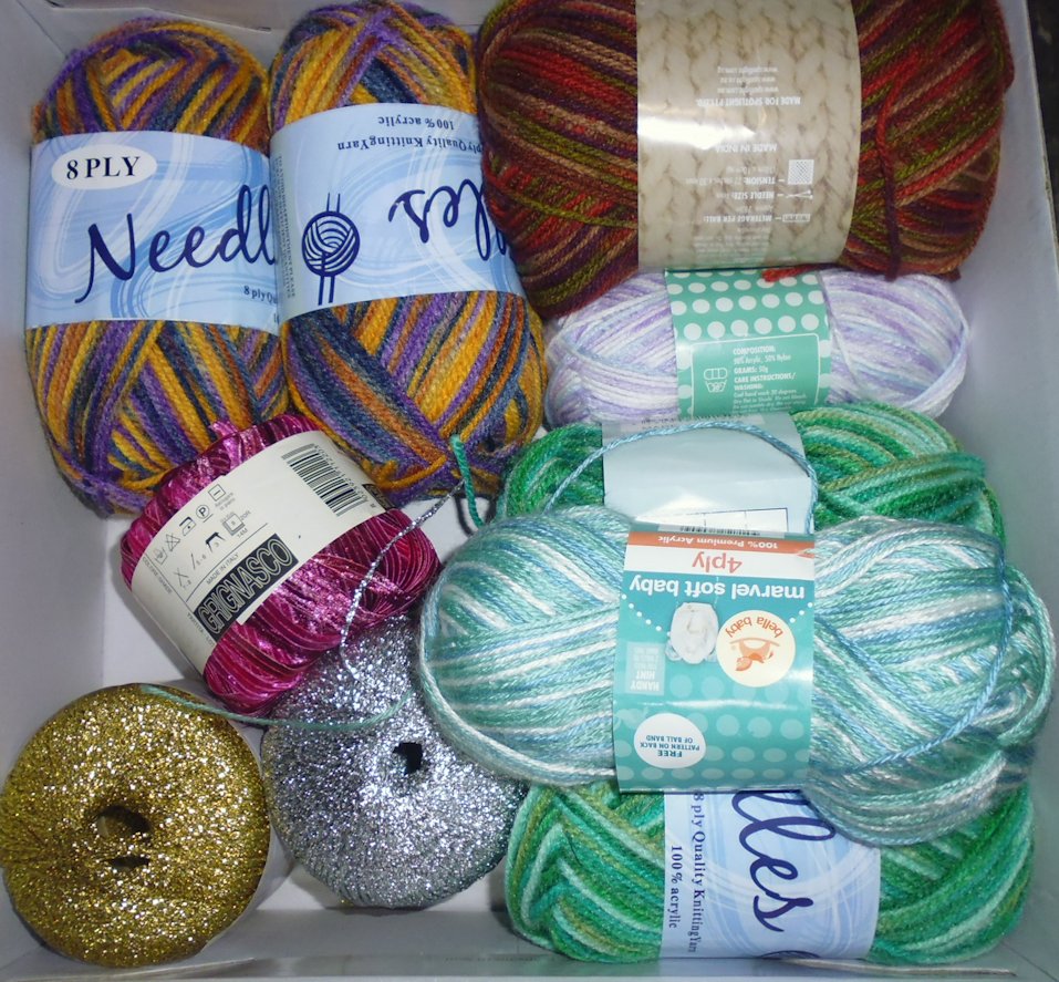 This was my previous yarn ‘stash’ – 8 balls of yarn, 2 of metallic, and one ribbon yarn….