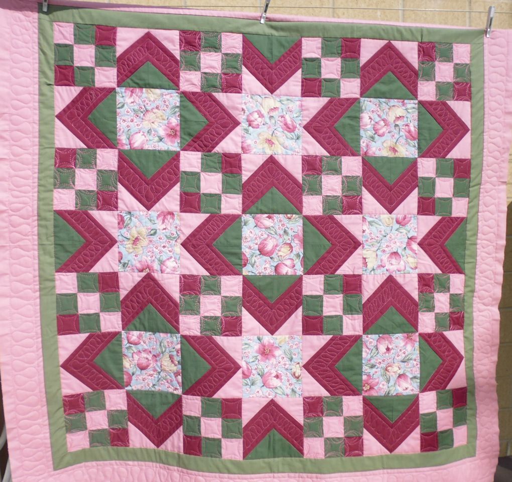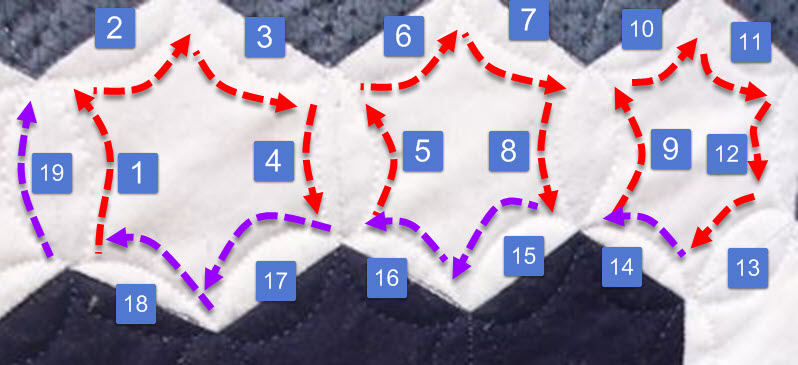 For the stars, I just stitched in the ditch, then did some McTavishing in the white space. It took a while to decide what to do with the 3-strip panels. I thought about feathers then figured they’d look out of place with the straight lines of the diagonals, so I did some mountain peaks (no rulers or marking) along one side first, then echoed back on the other side.