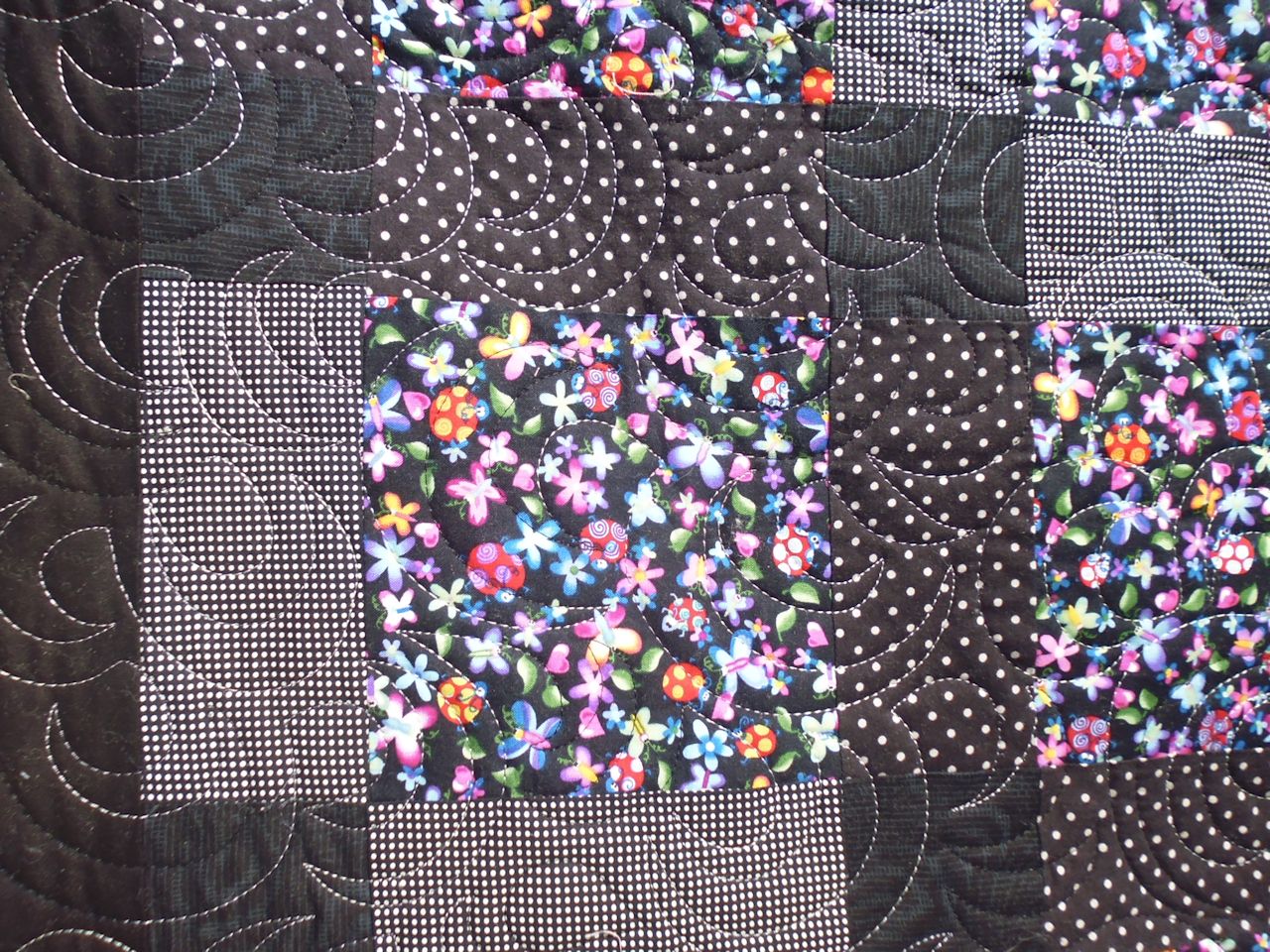 Another scrappy quilt. This one was made up of lots of half-square triangles, with two large stars formed from some of them. And then there was a strange 3-strip panel on each side.
