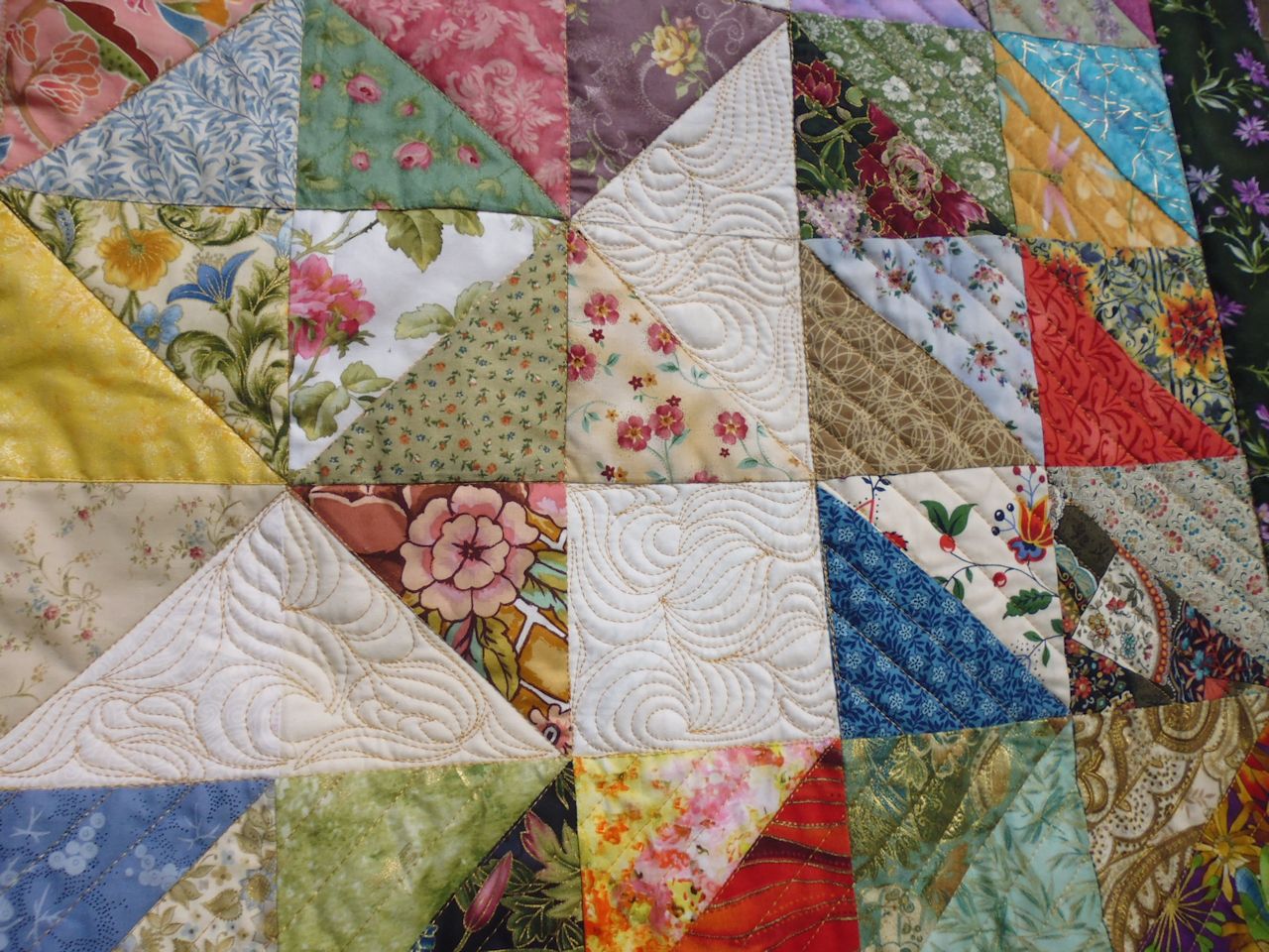The direction of the main triangles leant itself to some straight-line quilting. I stitched in the ditch along the main diagonal seams first, the through the middle, then through the space created by those lines. I liked the effect, especially as I used a gold thread (NOT metallic) to set off the many fabrics that had splashes of gold in them.