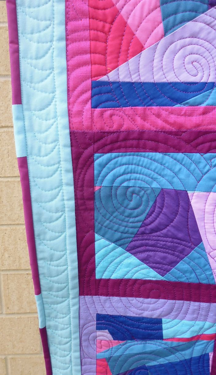 I made the quilt sandwich from the background fabric, the Pellon, and a cream backing fabric I had plenty of. Then I quilted it graffiti-style, using a variegated thread in cream, purple, and pink. After quilting it, I arranged various circles on the top and fused them down with the iron. Next, I stitched around each (and in some cases, inside each) with either invisible thread or gold metallic thread. Then for some of the large circles I stitched rings (like Saturn’s) using gold metallic thread. Finally, I fused on some more circles and raw-edge stitched them down, before trimming the art quilt and adding the binding.