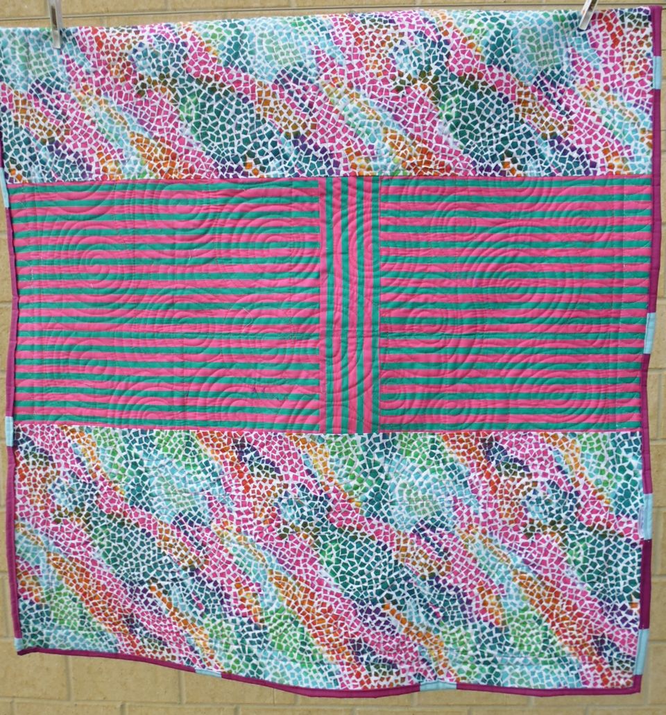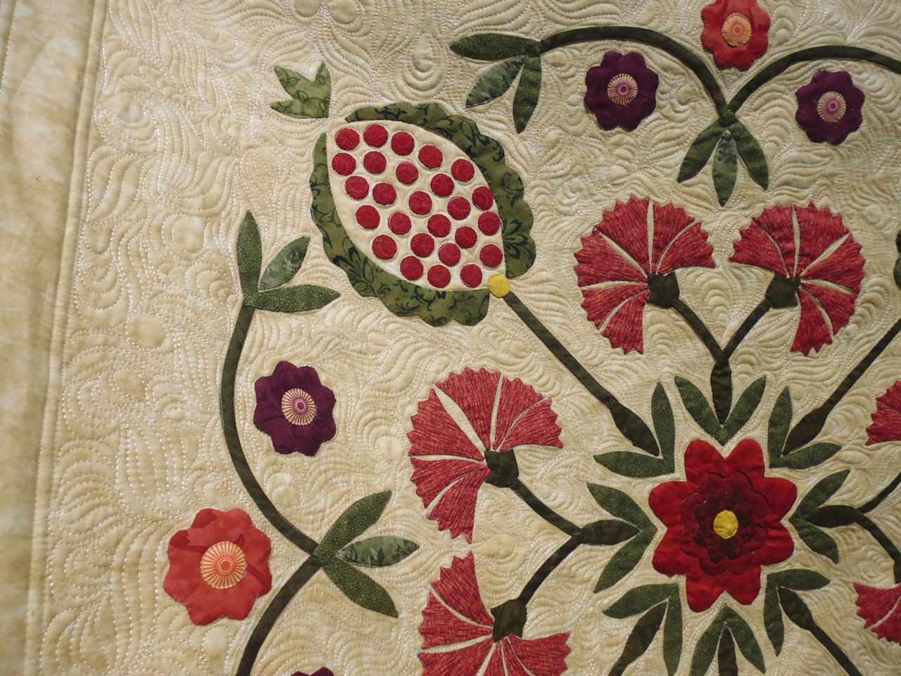 The background fabric for this one was a piece of upholstery fabric I’ve had for decades — I re-covered two 2-seater sofas with this fabric back in the 1980s! I had about half a yard left, and so used it for the background and the binding. It was nice and strong so was perfect for lots of stitching, but a bit thick for the binding. No matter. It’s almost all gone now — yay, busting the stash!!
