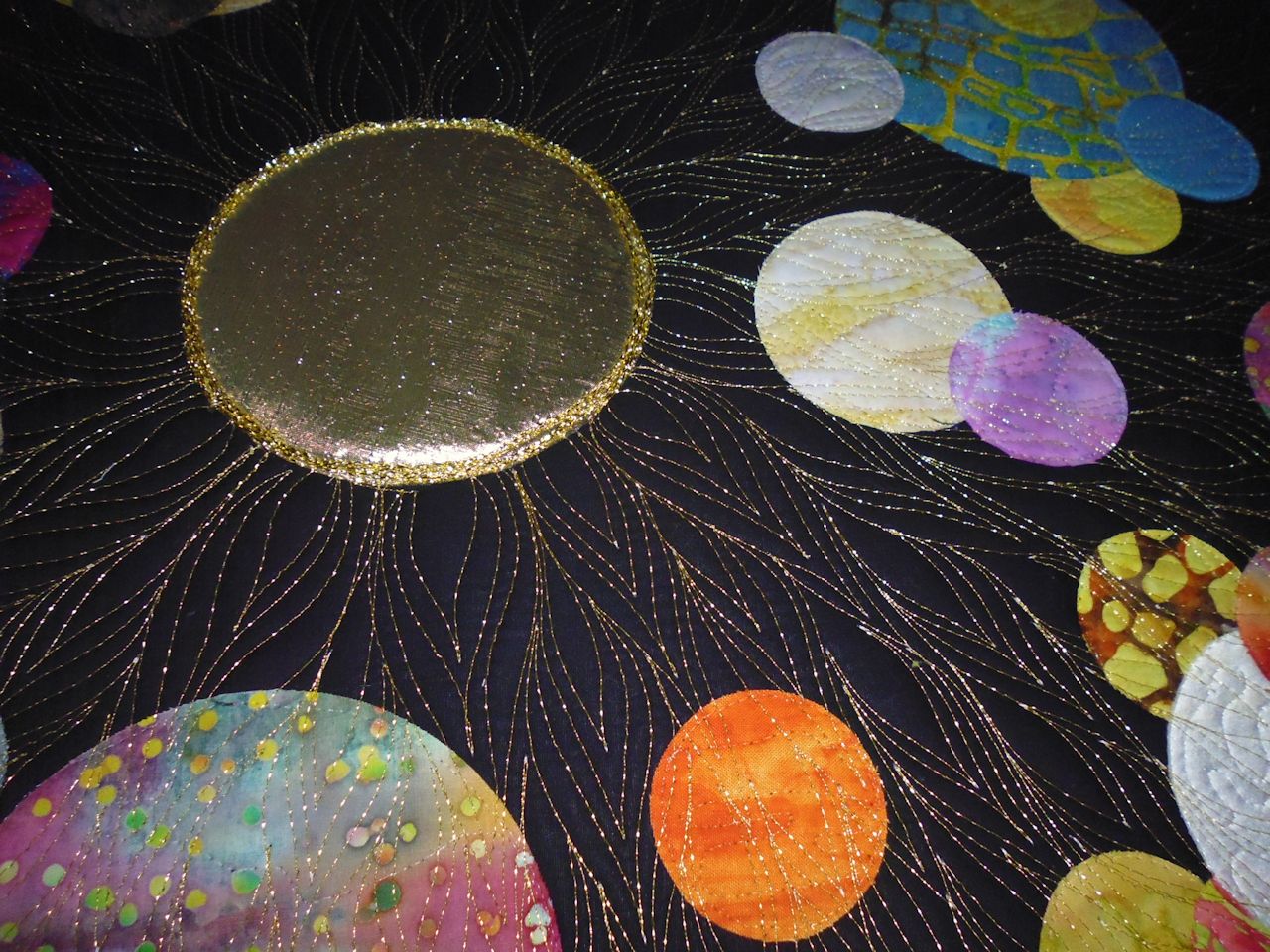 For the second one, I used black as the background fabric to get that feeling of deep space. I made a large circle of gold metallic fabric (lame?) the focus, arranging the other planets and moons around it but not touching it. After fusing everything down, I stitched around each circle (and inside some) with invisible thread.