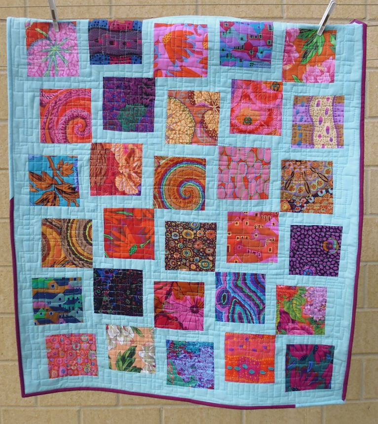 I received a bundle of 5″ charm squares as a gift (Kaffe Fasset fabrics from the Rowan Spring 2014 collection by Westminster). I’m not a fan of charm square packs as I never know what to do with them. So I laid these out and auditioned some fabrics as sashing strips, deciding on a clear aqua blue cotton I’ve had for decades. I used an offset arrangement, whereby I added sashing strips to only two adjoining sides of each charm square, then arranged them so they looked wonky.
