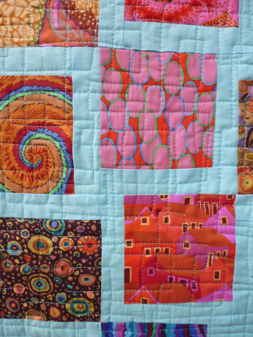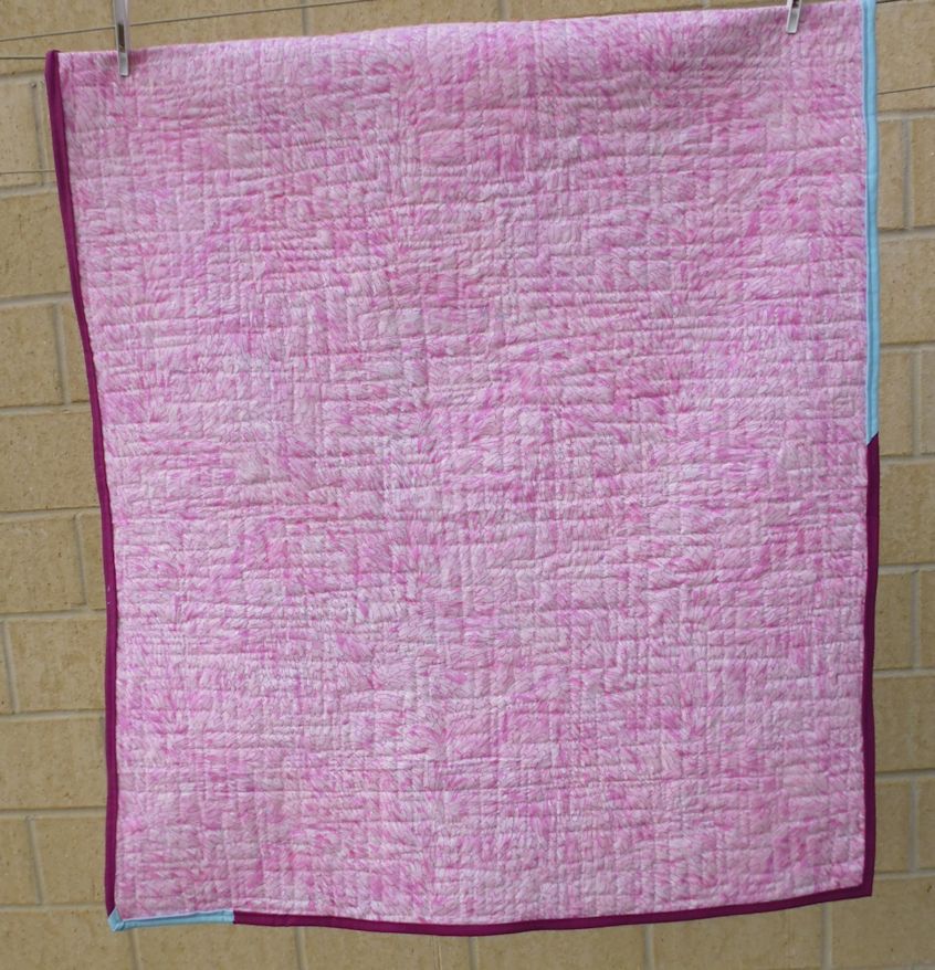I quilted this quilt with a square meander, and added a mixed fabric binding using offcuts from the aqua fabric and some coordinating maroon fabric (also from my decades-old stash). The backing was also fabric from my stash.