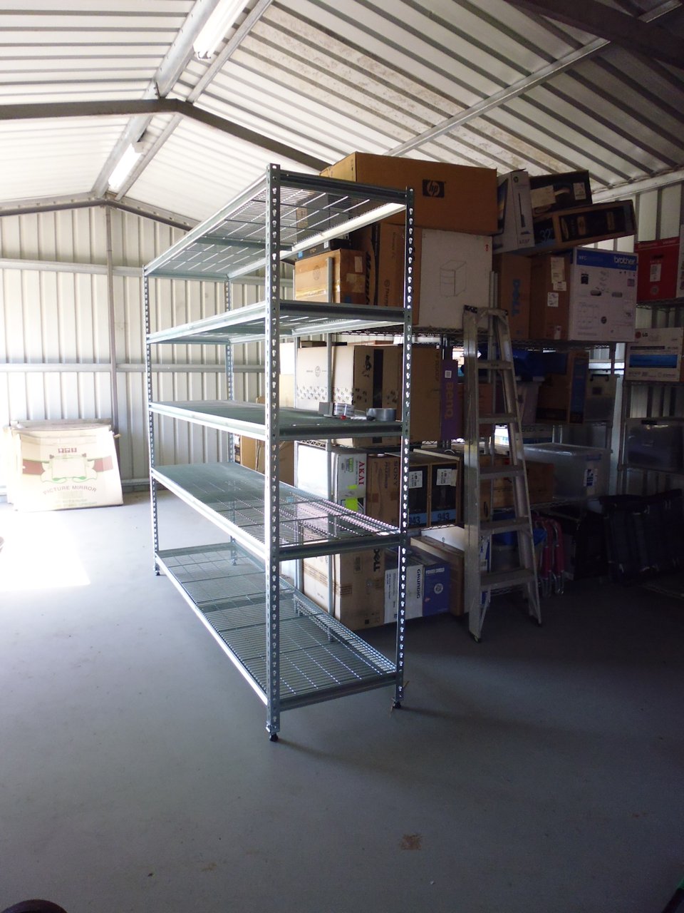 The second unit was much longer than the first, at 2.4 m (both are 2.1 m high, with 5 shelves), but as there’s a centre dividing support, the shelves were only 1.2 m long and were very easy to get into place. And because I’d already constructed the 1.5 m unit, this second one was easy to put together, taking me about an hour.