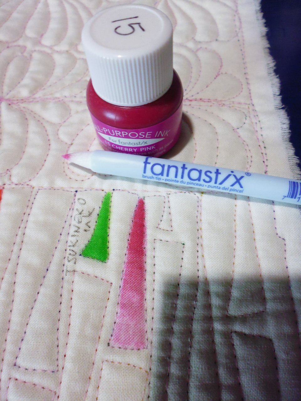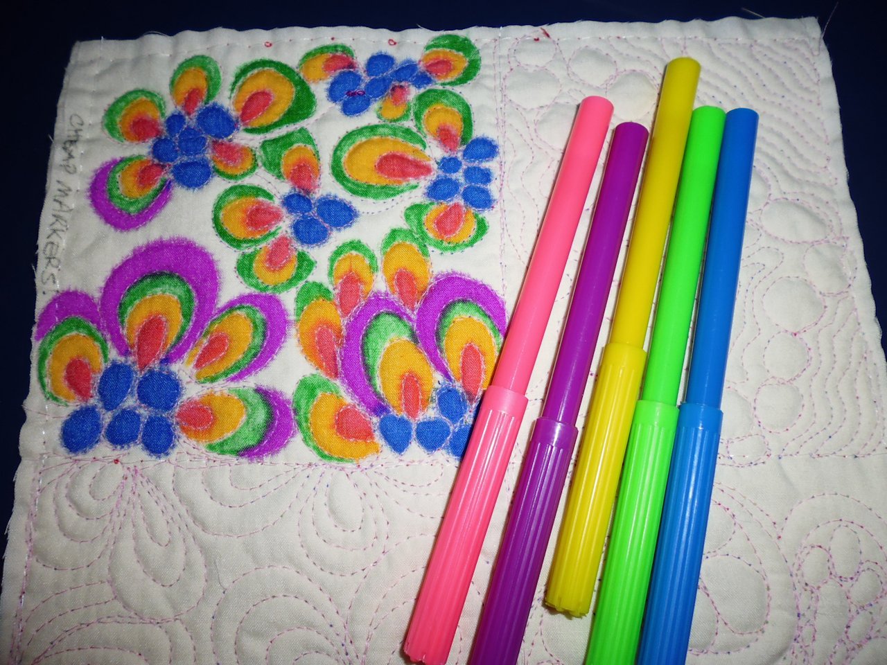 • Colours are much darker on the fabric than the colour of each marker would indicate — the pink, yellow, and green, especially, came out very dark