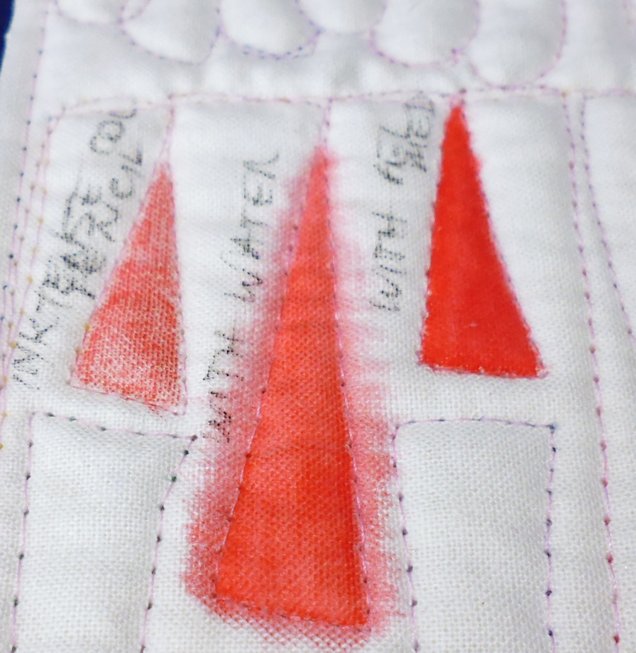 I used some of the quilt sandwich samples I made when I created a library of free motion quilting motifs based on Leah Day’s project. I needed samples that had closed spaces and found several that worked well. The fabric was a calico or quilter’s muslin (can’t recall which), with a single layer of batting (unknown type). After the first test (Copic Sketch markers), I used the backs of the samples so that the stitching wasn’t as obvious, and also to test if any of the colours bled through the fabric and batting layers (none did, so that was good). I deliberately chose rich colours for my testing as these would show bleeding more obviously than pale colours, and would be more likely to show through on the other side. I did not wash, iron, or heat set any of the samples.