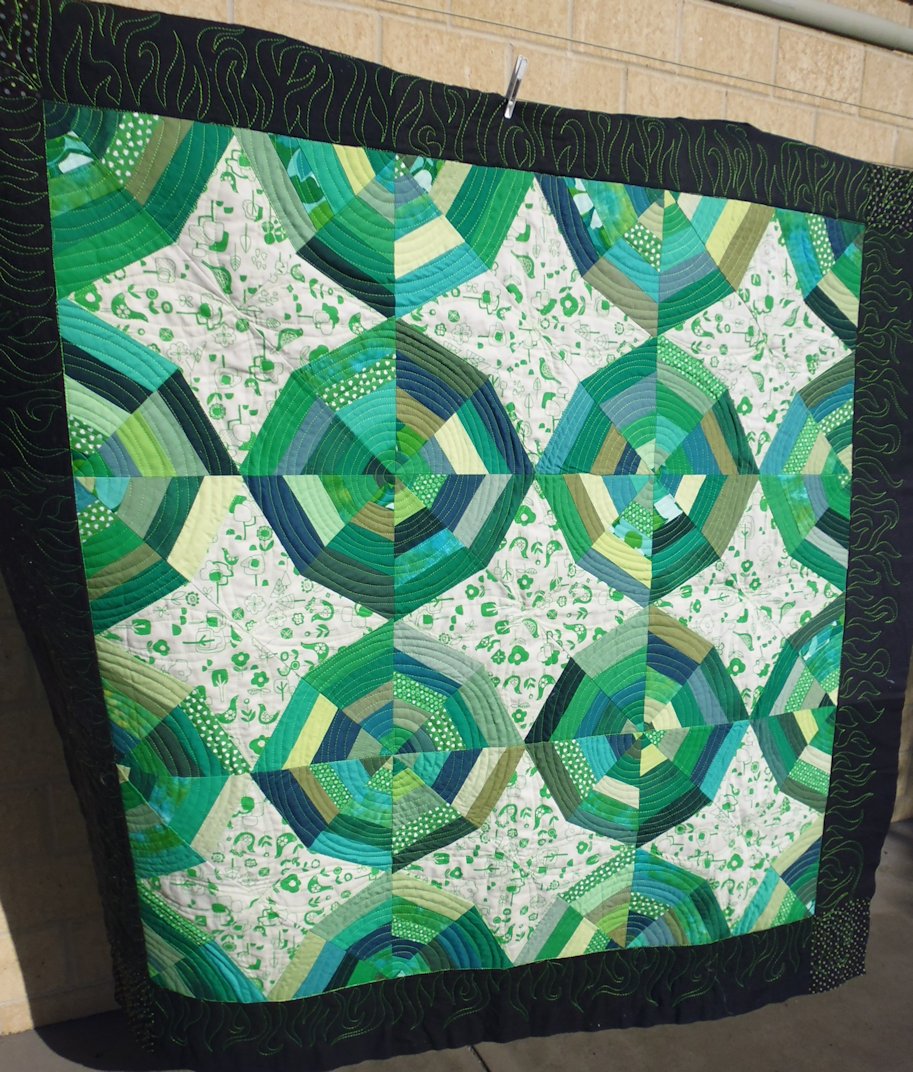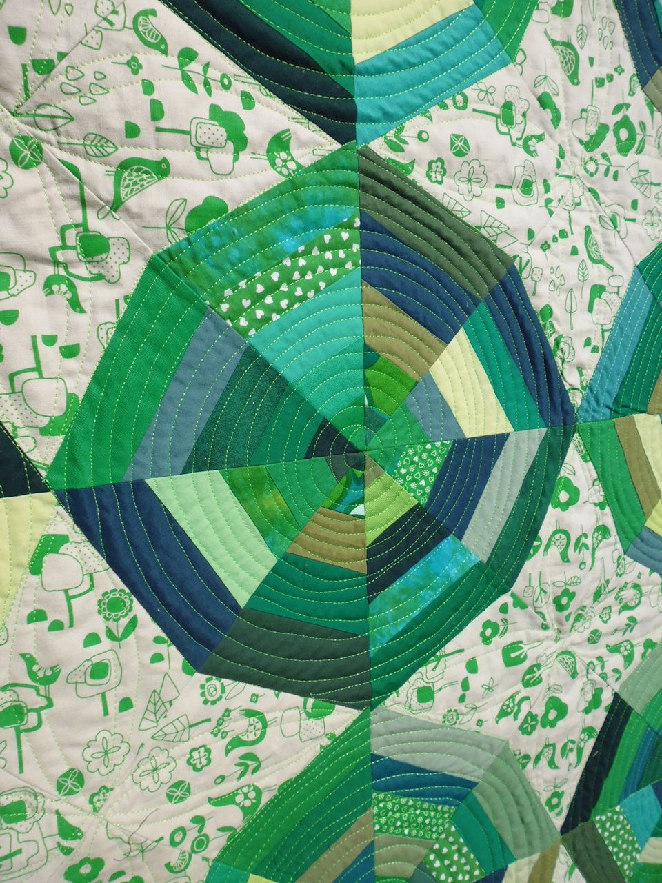 This was a BIG quilt, with the potential for lots of puckering with all those bias edges in the octagons. I started by stitching in the ditch around the main elements, then stitching echoed 4-petal flowers in the white spaces. I free-motion stitched BIG spirals in the green areas (thank goodness for quilting gloves and my Sweet Sixteen’s quilting table and extensions, and my bungee cord system!).
