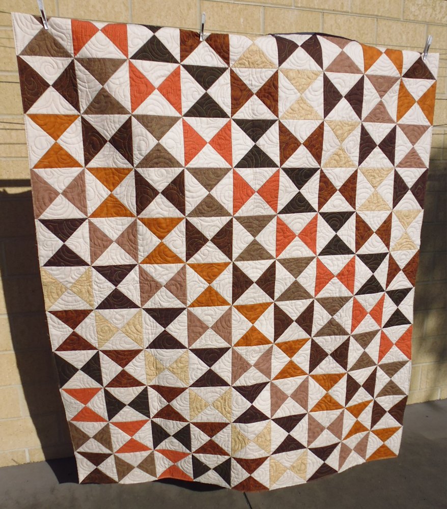 Another big quilt, this time of half-square triangles in autumnal colours. After stitching in the ditch around every stinkin’ seam, I decided to do an all-over motif based on ‘open headbands‘, using a variegated autumnal thread.