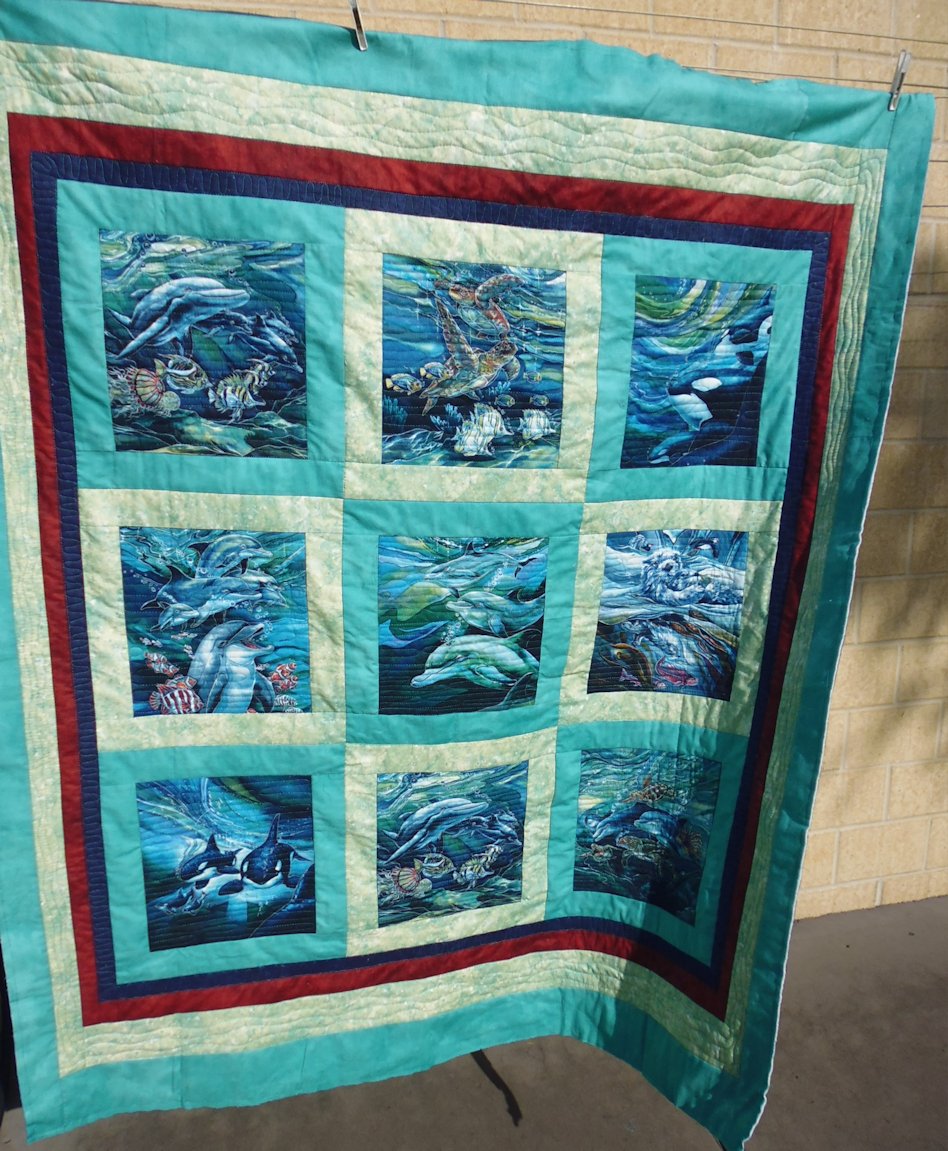 This big quilt was filled with panels from a marine-themed fabric, and surrounded by matching borders and sashing strips. After stitching in the ditch around all the blocks and borders, I did a water-style stitching motif in the panels, with wavy lines in the light green border and a sine wave in the thin dark border. I left the other areas unstitched.