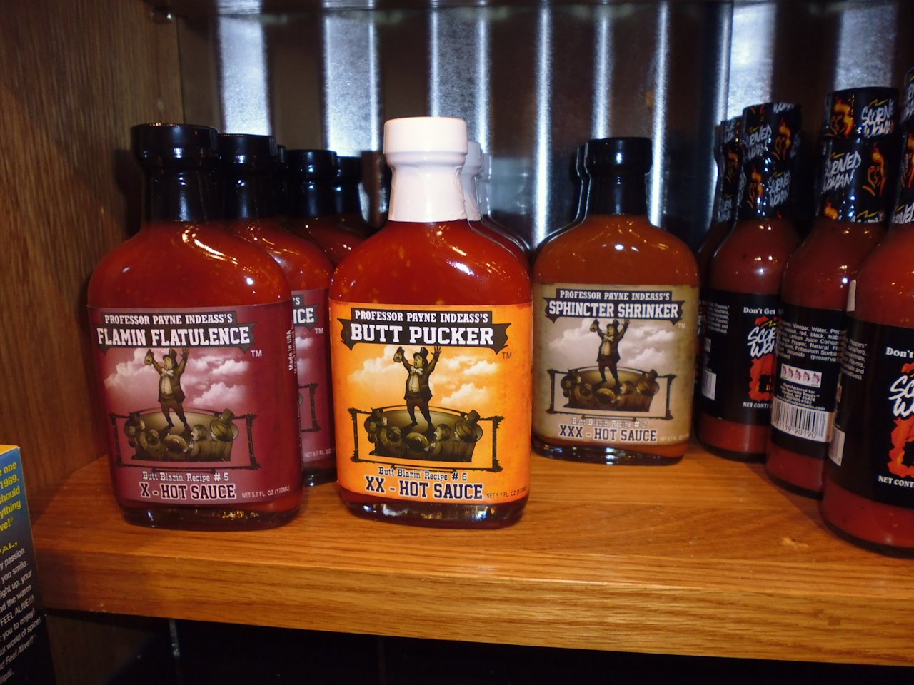 I tasted the ‘Sphincter Shrinker’ one and the Dave’s ghost pepper one — damn, they were HOT! But good. A tiny bit goes a LONG way…