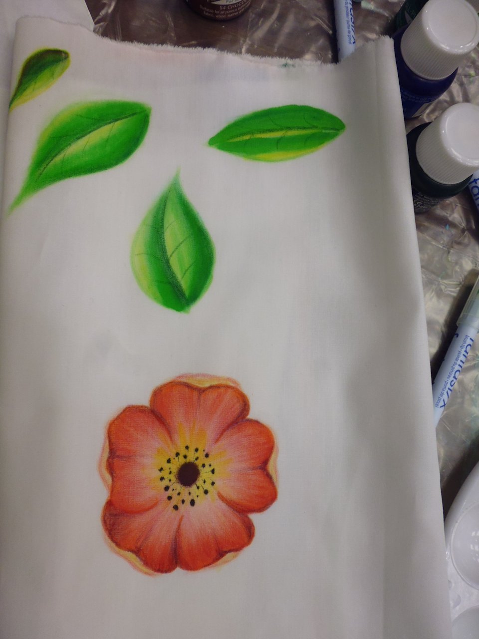 And here are my efforts — The first photo is from the morning where we learned to use the applicator and lend colours; the second is from the afternoon when we applied the inks and aloe gel with paint brushes. I was quite pleased with the passion flower from the afternoon; the leaves? not so much…