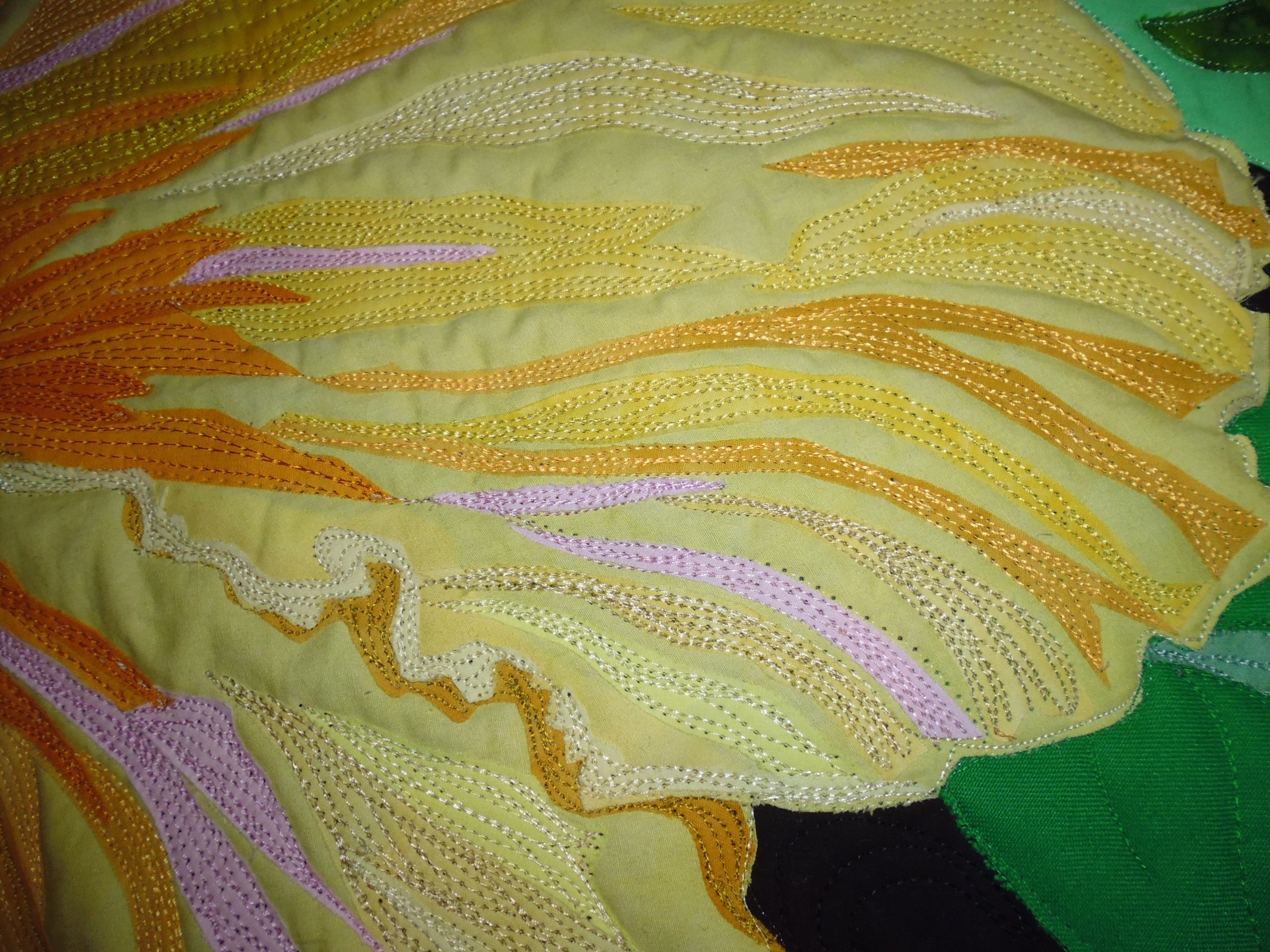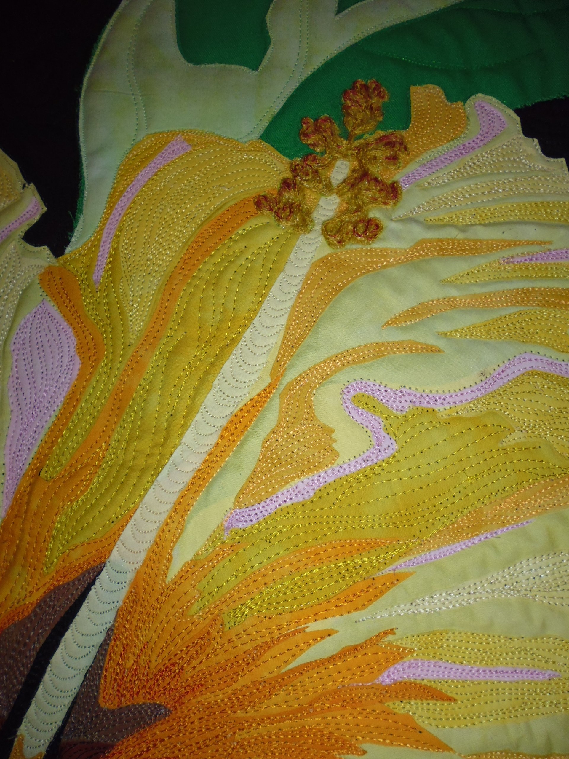 I did some fairly heavy ‘thread painting’ on it, but left some of the yellow areas to ‘pop’ — just like the ridges on a real hibiscus flower. For the pollen heads, I couched some fuzzy yellow yarn, then lightly touched the tops of them with a red Copic marker. The patterns and all fabrics for the flower and the stem were from the kit Melinda supplied for the class (each person chose a different coloured kit for their hibiscus — I chose the yellow, though I could have chosen pink or purple). I supplied the background fabric and the green fabrics for the leaves. And yes, there are HUNDREDS of pieces of fabric fused in the petals…
