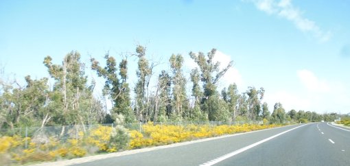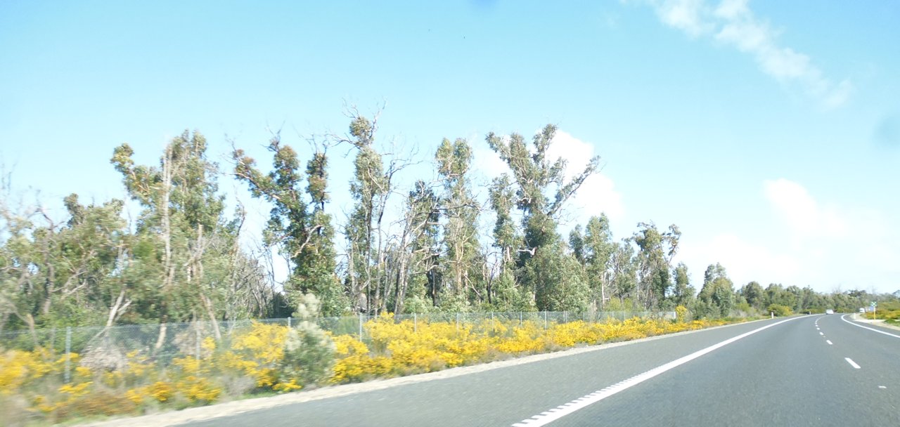 A year to the day that Yarloop was all but destroyed by one of the worst bushfires in Western Australian (European) history, I travelled to Perth along Forrest Highway, which the fire had jumped on its path of destruction to the coast. The bush is recovering slowly, with many weed species taking hold. The grass trees have sent up many spears (stimulated by the fire?), though not all are straight — many are very twisted. I don’t know if the twisting is natural or a result of the trauma to the plants by the fires. Many other trees/bushes are dead and will eventually fall over/drop branhces, or be taken over by other vegetation.