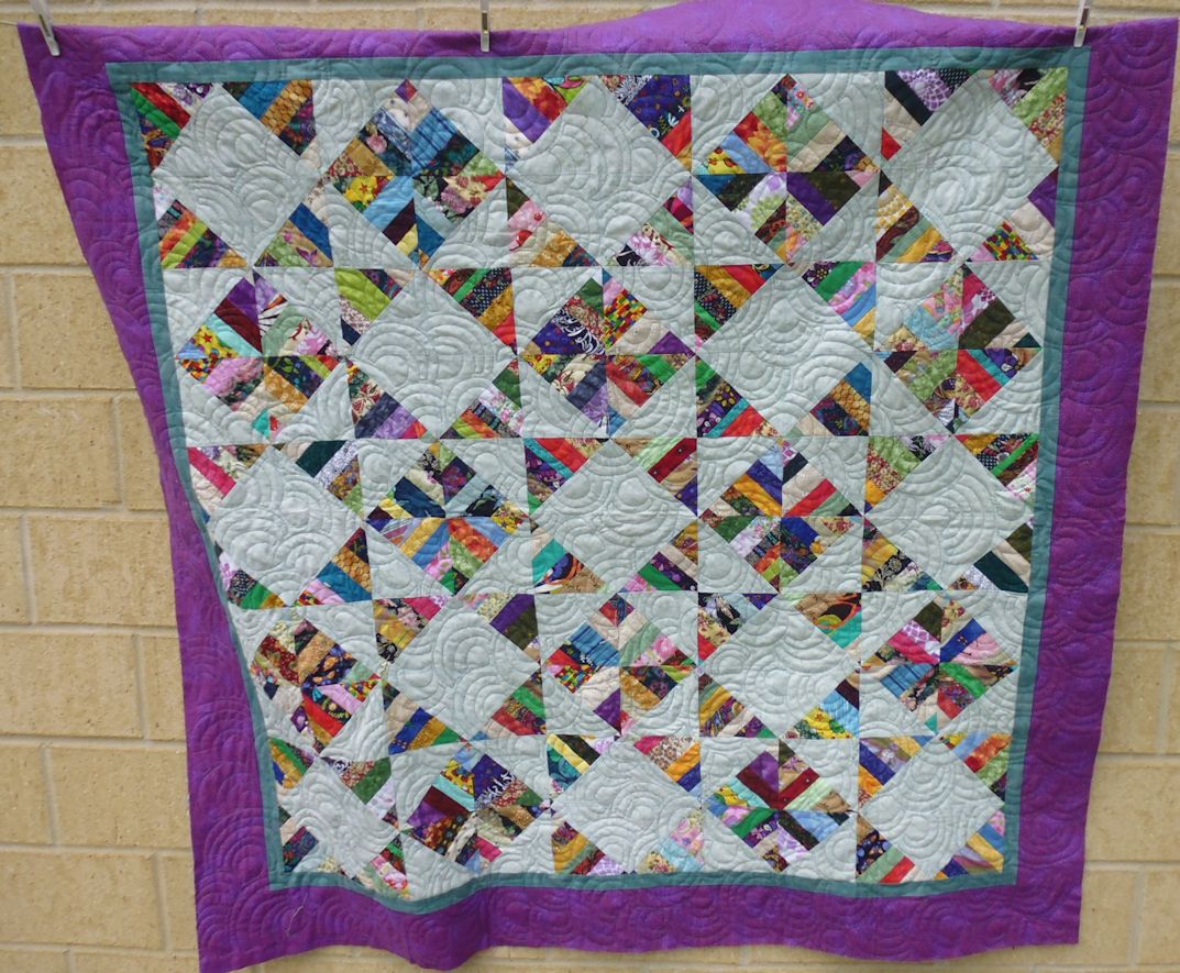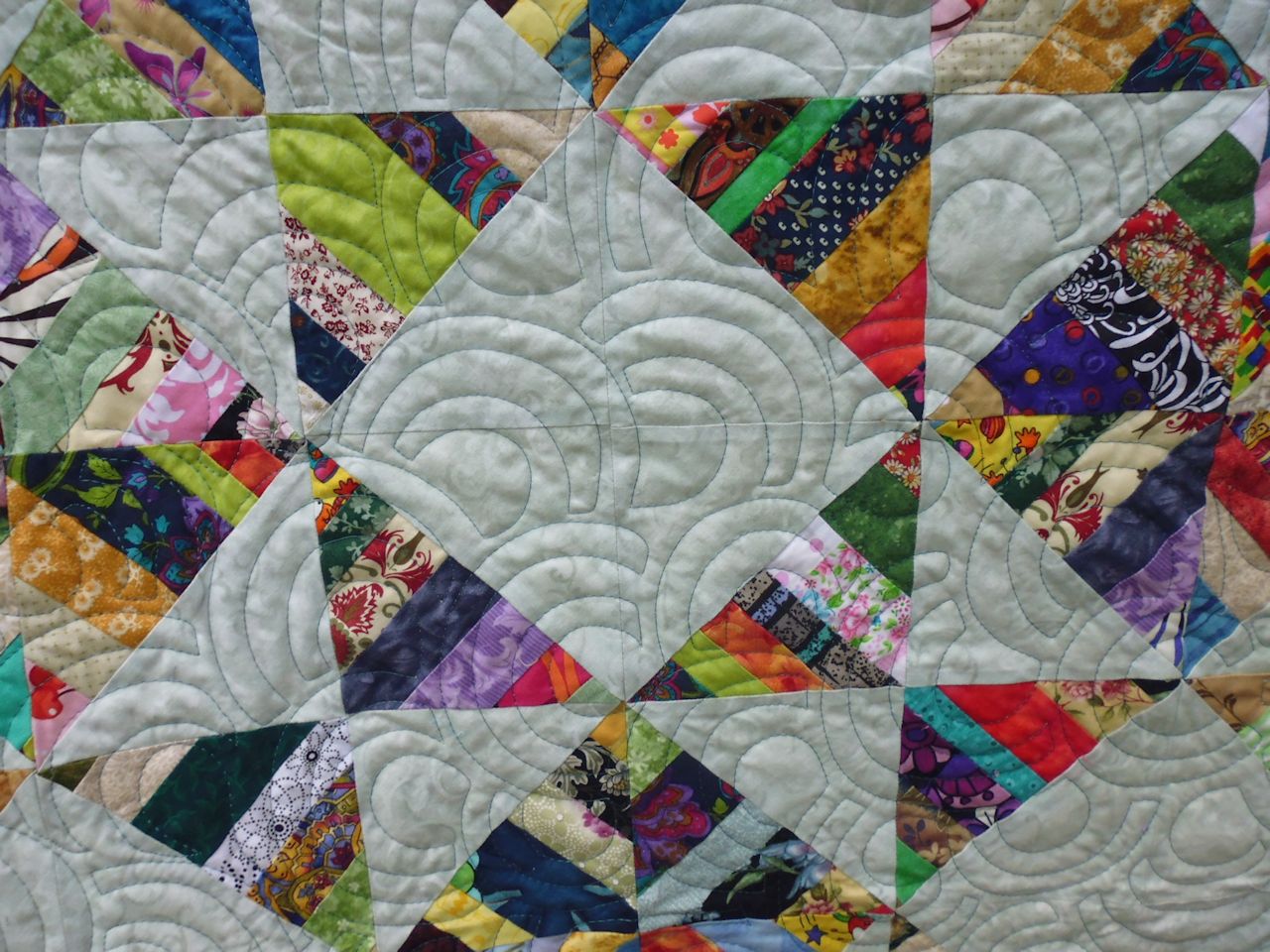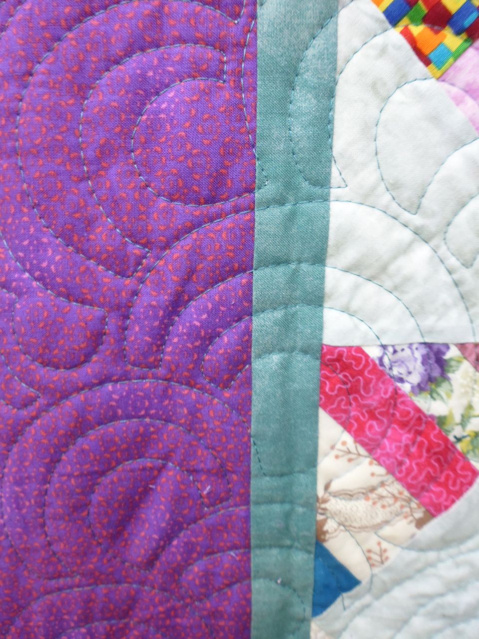 I decided to quilt this scrappy quilt with a blue/green thread that matched the colour of the inner border—I was pleased with how well it matched the rest of the quilt as well. To counterbalance the geometric shapes, I stitched a squared-off arc motif, which is a variation of the open headband motif I use quite often.