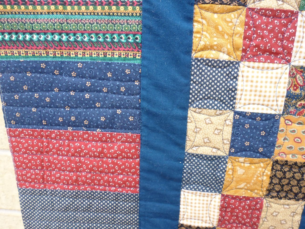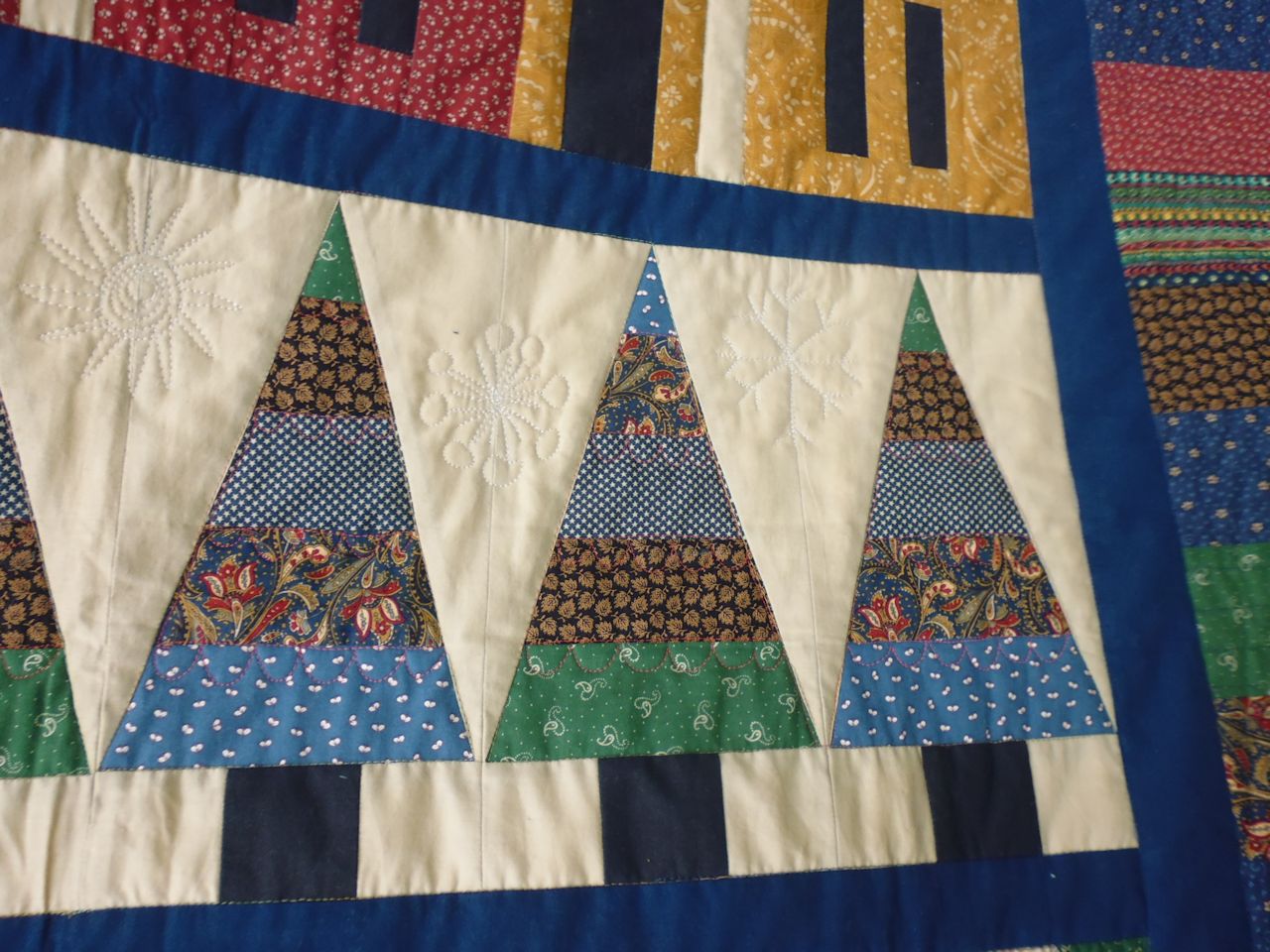 For this BIG quilt (yes, I had to hang it sideways on the clothesline to take the pictures!), I started by stitching in the ditch around all the elements. I didn’t want to overquilt it because the design needed to take centre stage, so I left many areas unquilted. However, I did a cathedral windows motif in the small squares, piano keys in the border, some pseudo snowflakes and a sun in the space behind the trees, and some wavy lines for clouds behind the house.