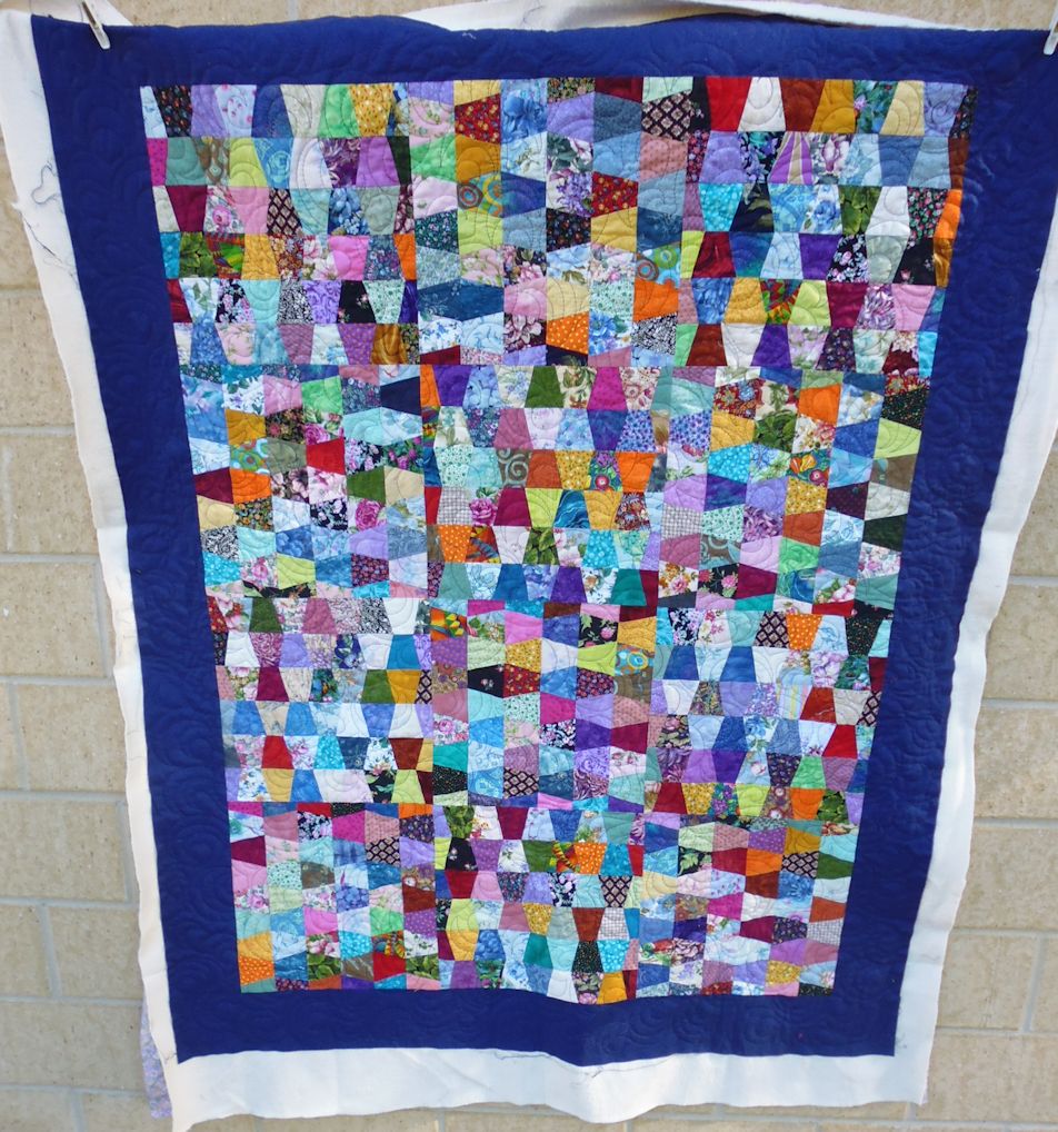 Another scrappy quilt. The ‘busy-ness’ of the fabrics meant a simple stitching motif, so I chose ‘open headbands‘, which is a muscle-memory motif for me — I think I could do it in my sleep!