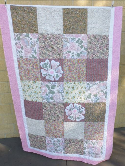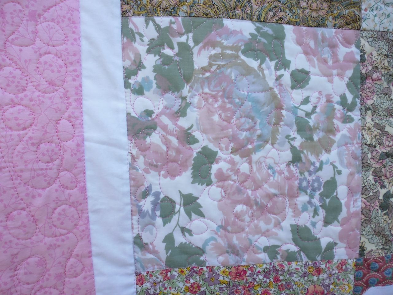 There were lots of very busy fabrics in this quilt, so I quilted it in an all-over motif — a meandering stipple, punctuated with circles. I repeated this motif in the pink border too, leaving the white border unstitched.