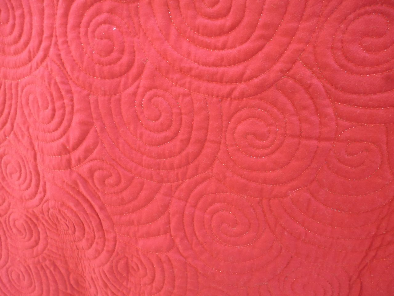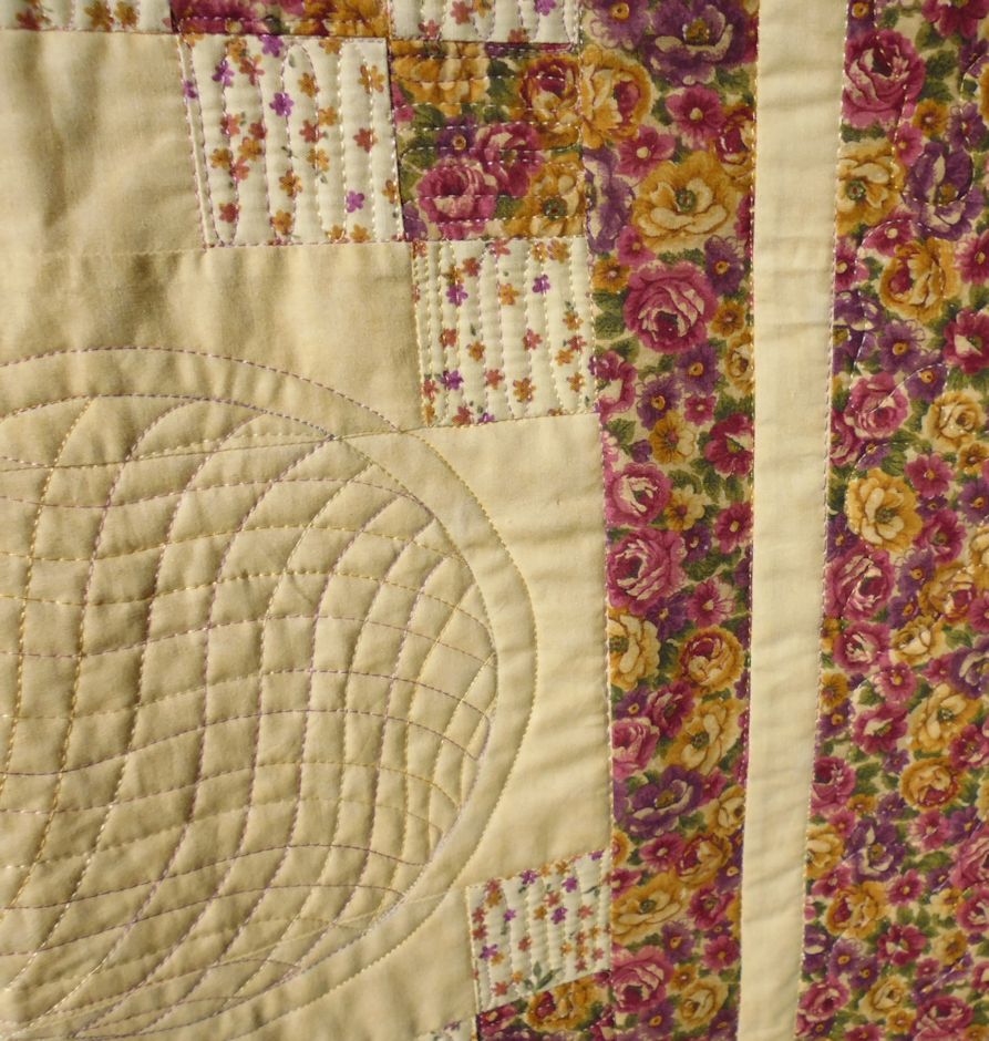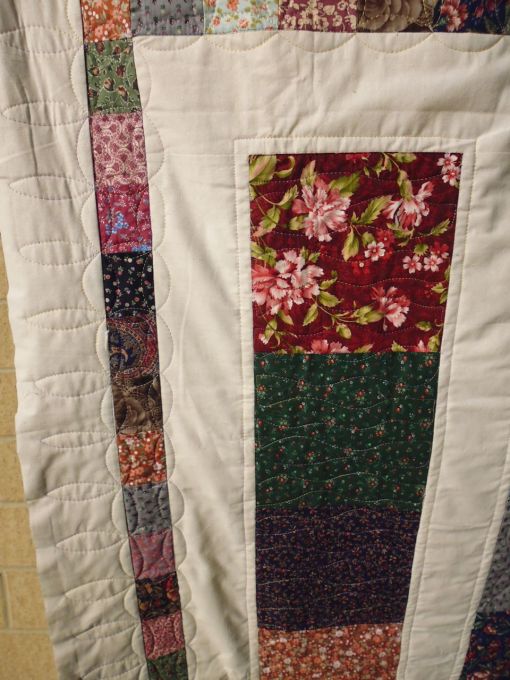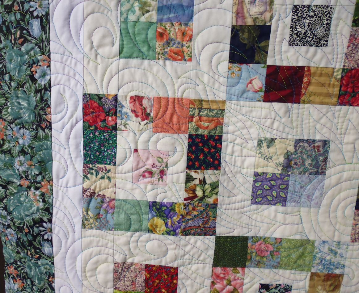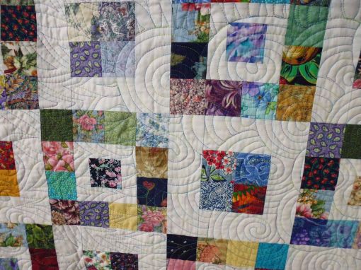 How to quilt this very geometric and colourful scrappy quilt? I thought about straight line ‘modern’ quilting, then decided to do a variation of ‘graffiti’ quilting. I started in the centre with large overlapping spirals, then a whole slew of flame-style stitching, finishing at the outer edges with a open headband motif. I used a variegated thread in blues, greens, yellows, and purples to match the vibrant colours of the squares.
